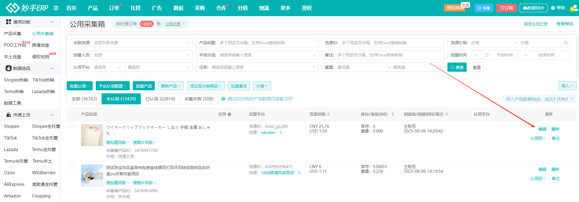 采集到的产品将存放在公用采集箱,做多平台的用户,可在公用采集箱中编辑产品信息,将编辑好后的产品再认领到对应平台,可减少编辑次数