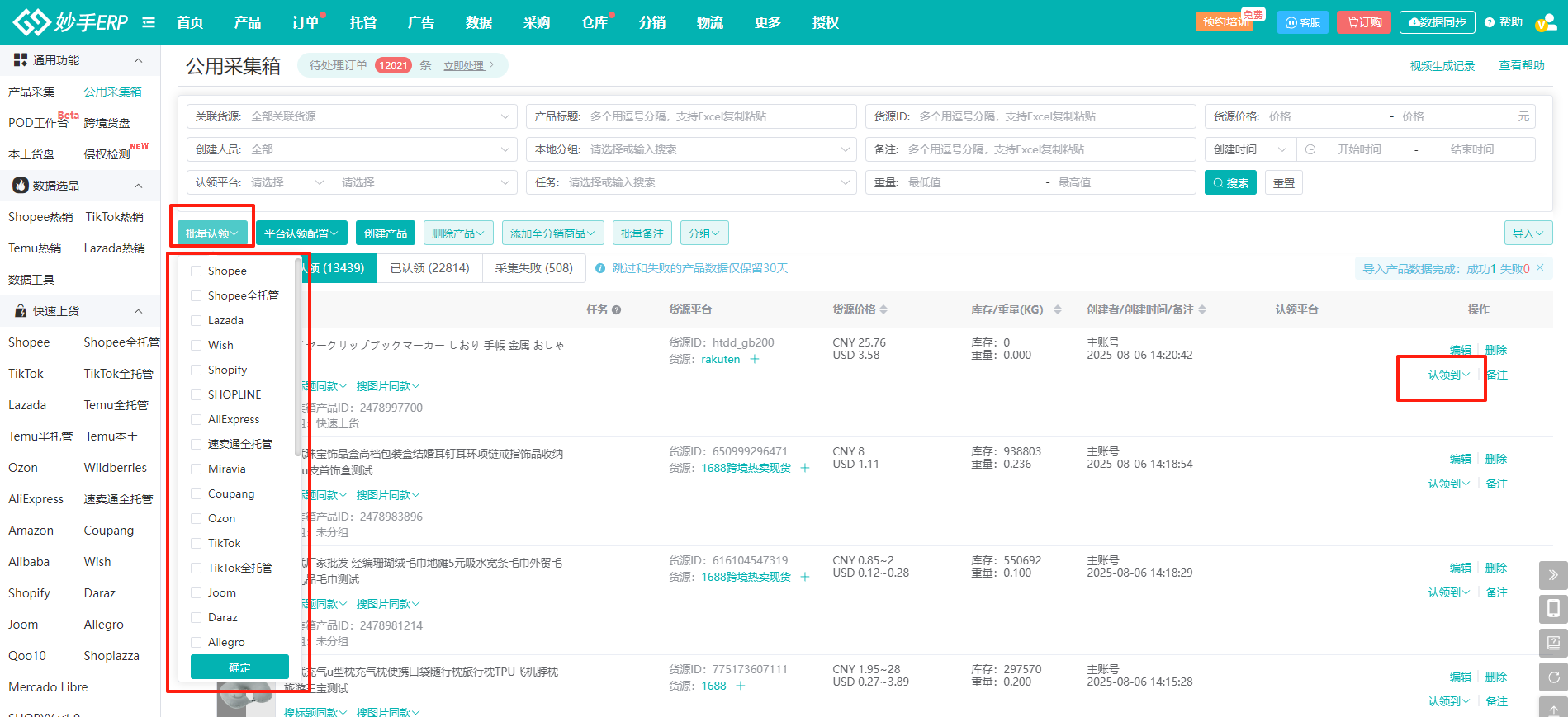 点击【认领到】/【批量认领】,选择需要认领的产品即可将产品认领到对应平台采集箱
