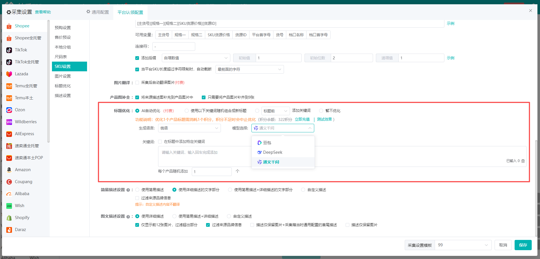 (2)平台认领配置新增AI生成标题功能,部分平台在标题优化的位置可选择豆包、DeepSeek、通义千问来生成标题
