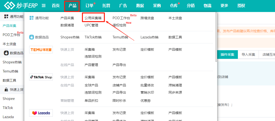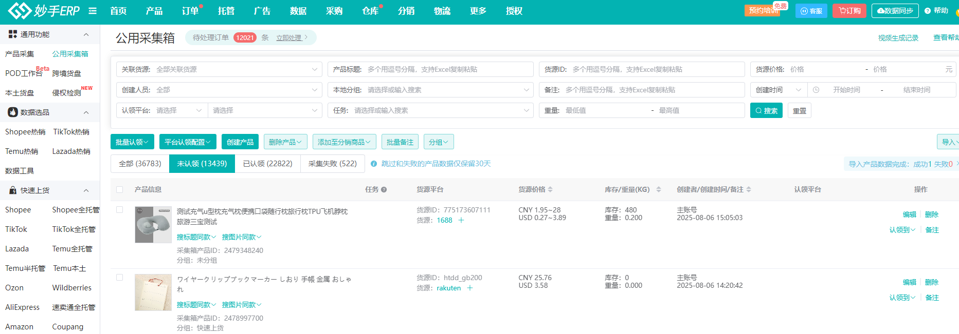 (4)采集后,回到妙手ERP,进入产品=>公用采集箱,可在此查看产品是否采集成功