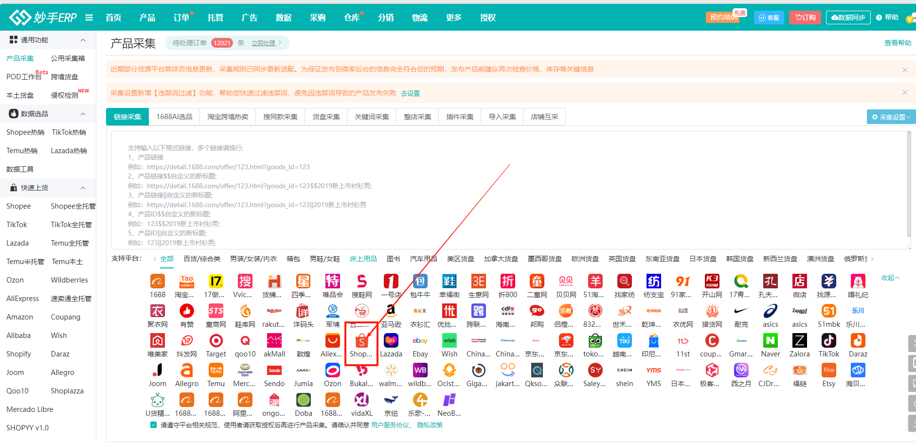 1、进入妙手ERP=>产品=>产品采集