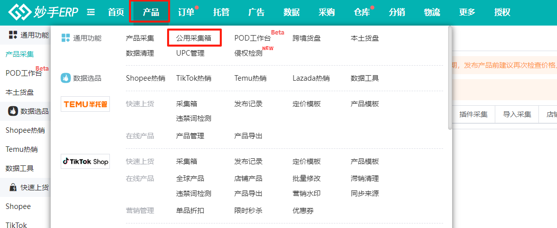 5、进入产品=>公用采集箱,可在此查看产品是否采集成功