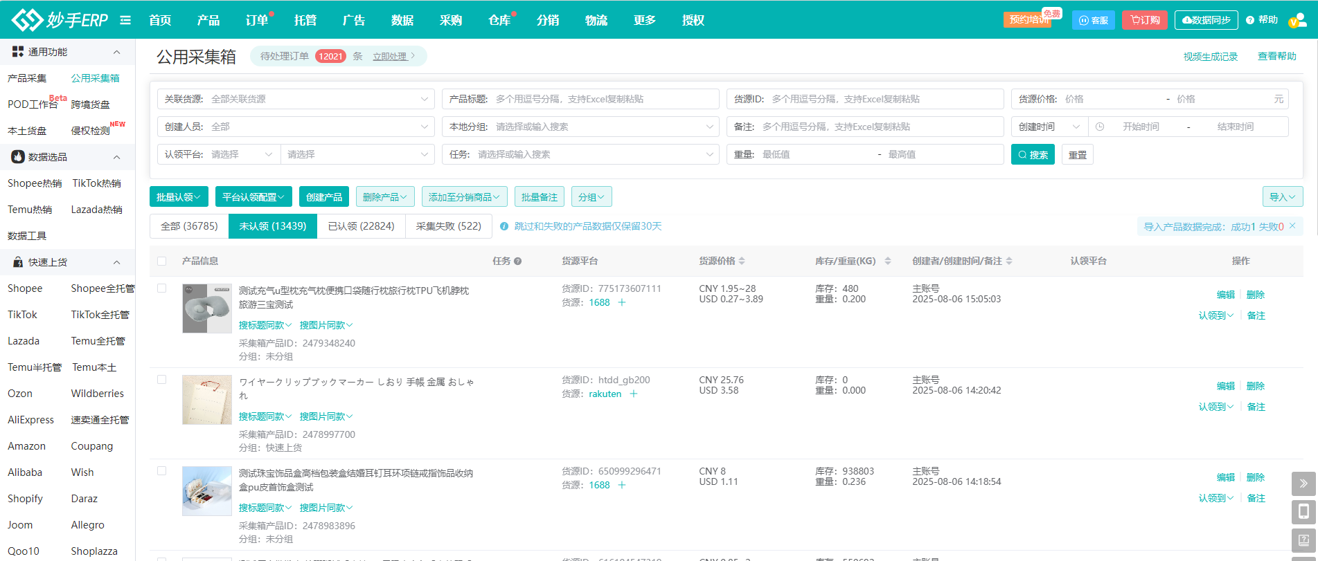 6、采集成功的产品会进入到“未认领”状态,点击【批量认领】,可将产品认领到平台采集箱后,进行产品编辑