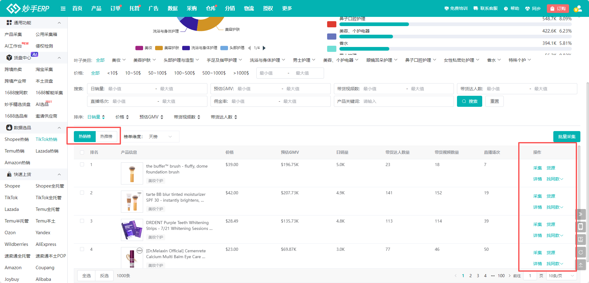 (3)同样可以查看本类目中的热销榜和热推榜单,并且支持采集、查看详情和找货源