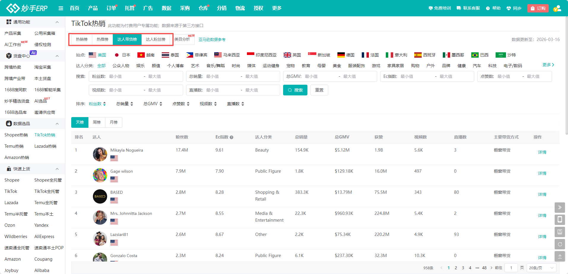 (2)TokTok热销分为热销榜、热推榜、达人带货榜、达人粉丝榜