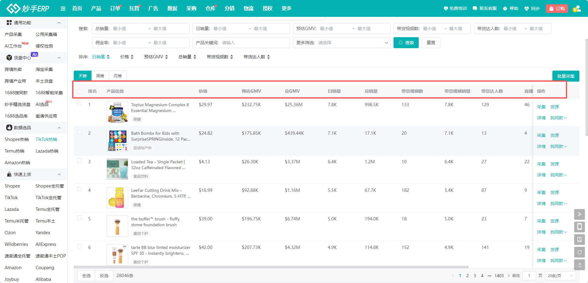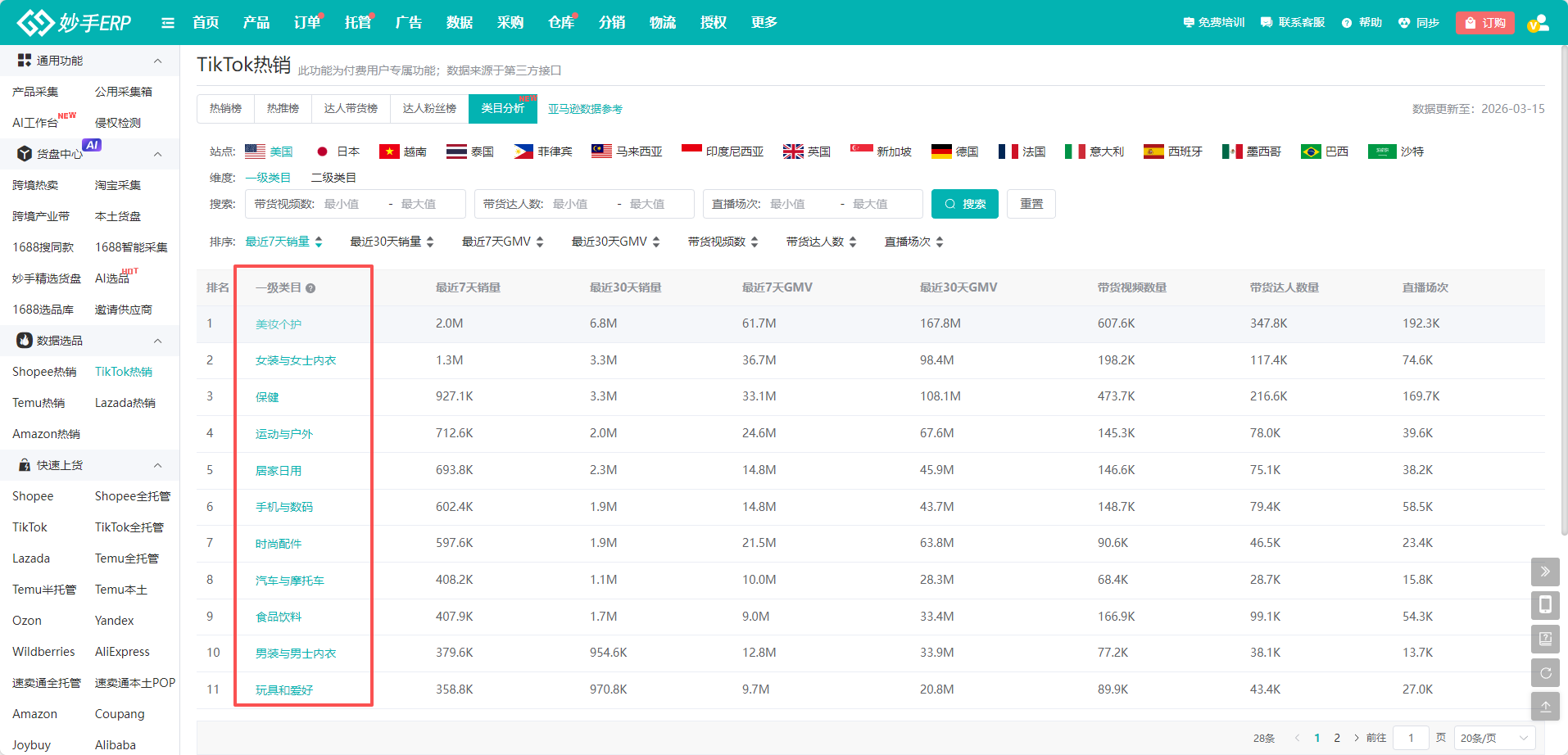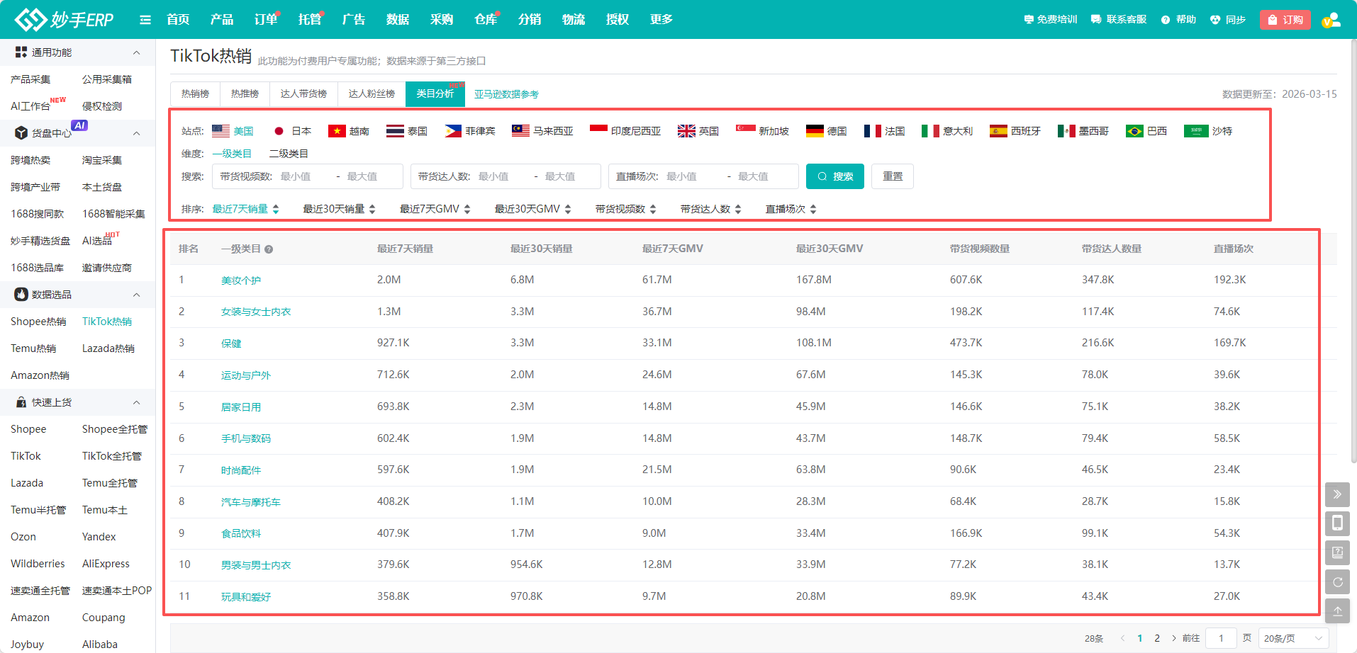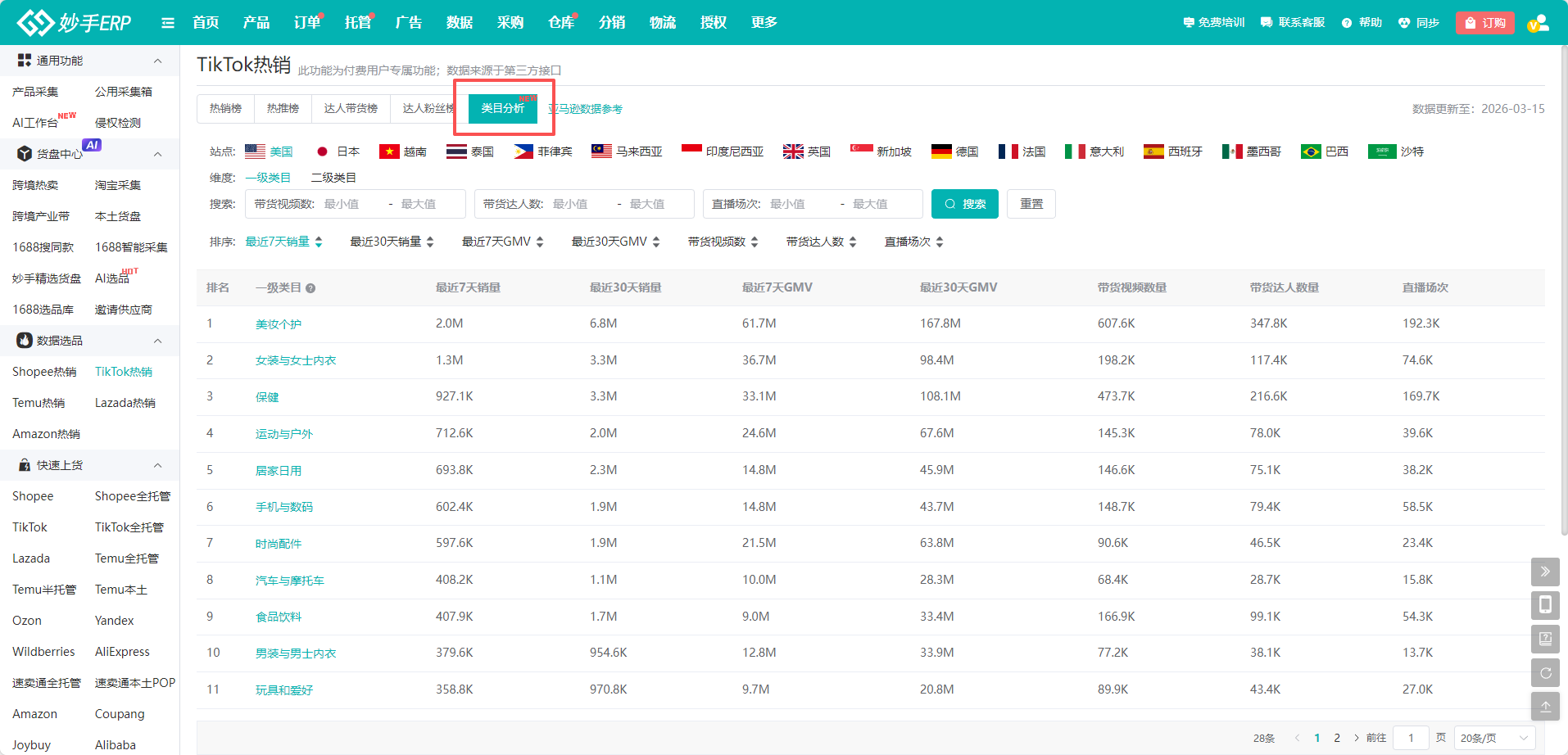 妙手ERP的TikTok Shop选品工具是专为付费用户提供的功能,免费版用户需升级后才能使用。该工具提供热销榜和热推榜两大核心板块,数据源自第三方接口,涵盖多站点、多类目的实时商品信息。用户可按站点、类目、价格、销量等维度灵活筛选,支持查看商品详情、排名、价格及带货数据,并可一键采集至采集箱,方便后续上架发布。同时集成“图搜同款”功能,可快速跳转至1688或淘宝跨境平台查找货源。类目分析模块还提供细分市场数据,助力卖家精准把握爆款趋势,高效完成选品决策。
