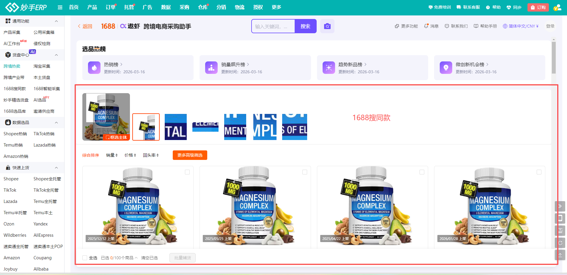 (5)支持使用图搜同款功能,找1688/淘宝跨境同款货源,点击找同款后,选择1688/淘宝跨境可直接跳转到搜同款,并采集该商品货源