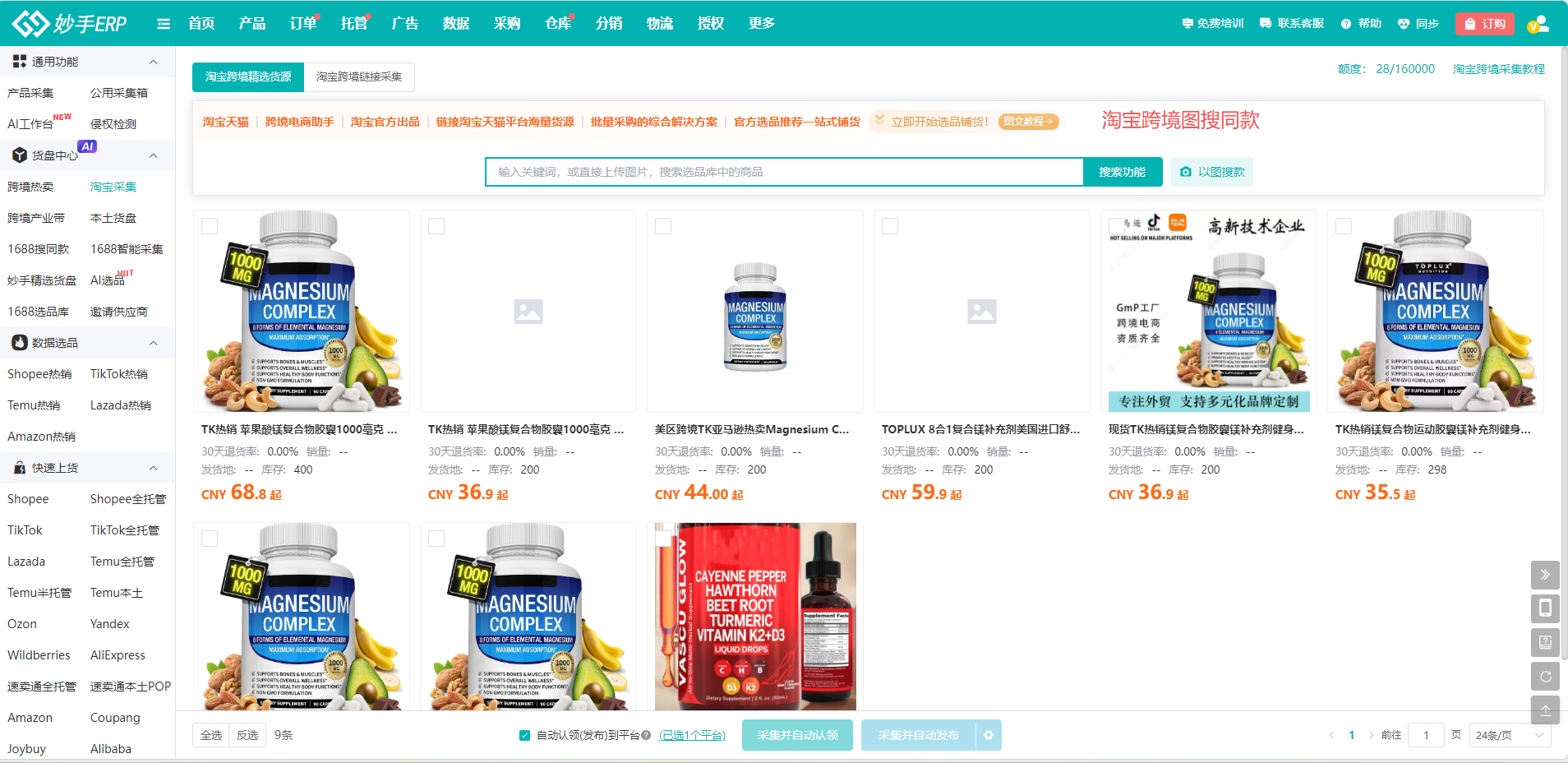 (4)支持批量采集、单品采集,将商品采集到妙手ERP中
