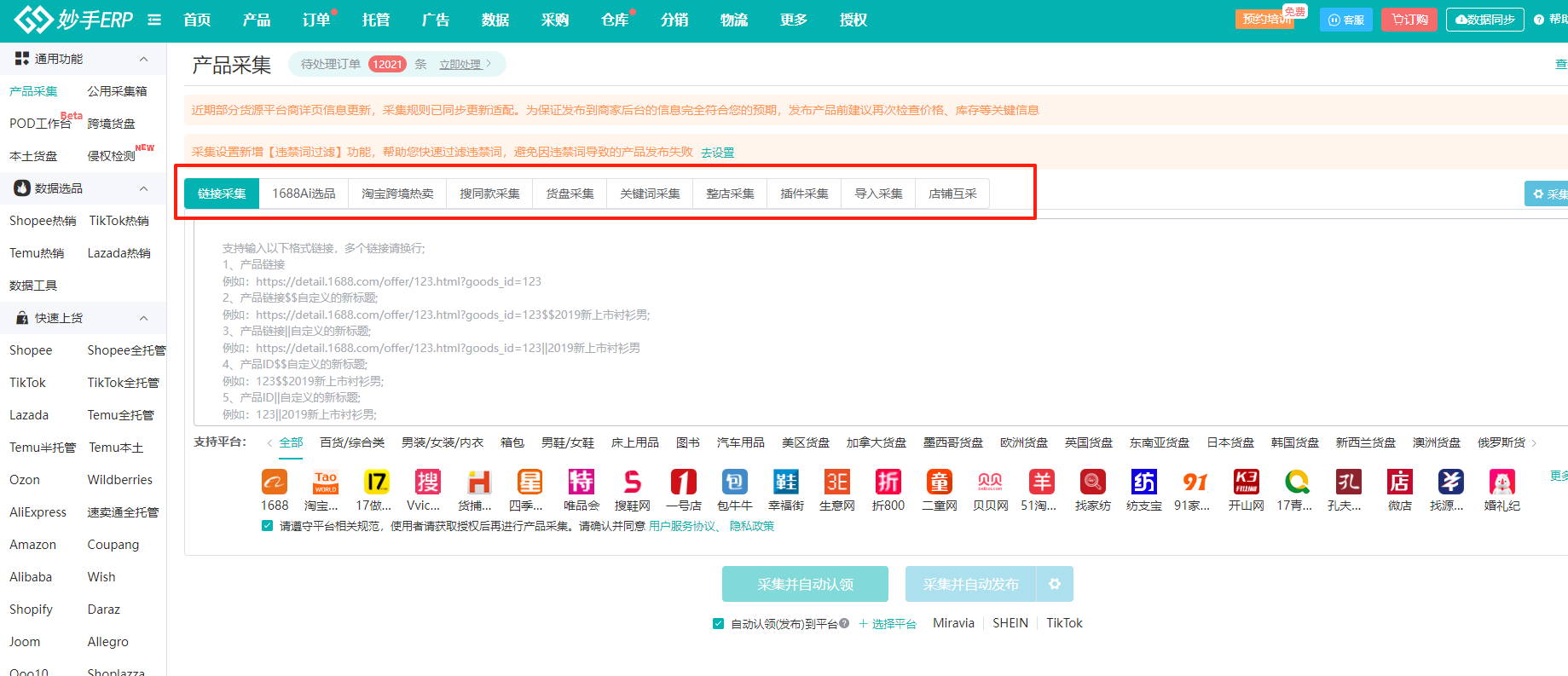 2、目前1688支持链接采集、关键词采集、整店采集、插件采集、导入采集、1688跨境市场一键铺货