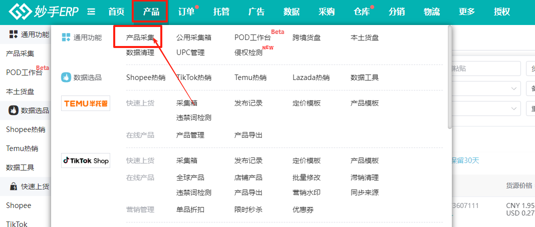 1、采集1688货源产品,先进入妙手ERP=>产品=>产品采集