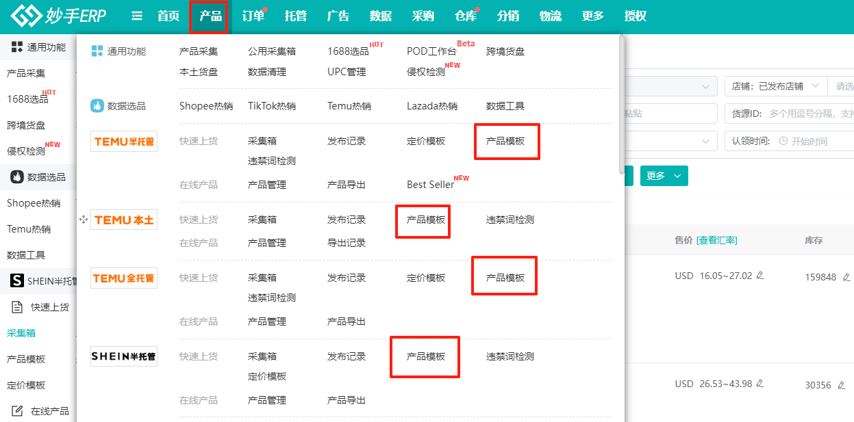 1、进入妙手ERP=>产品=>选择自己经营的平台:Temu半托管/Temu全托管/Temu本土/SHEIN半托管=>产品模板