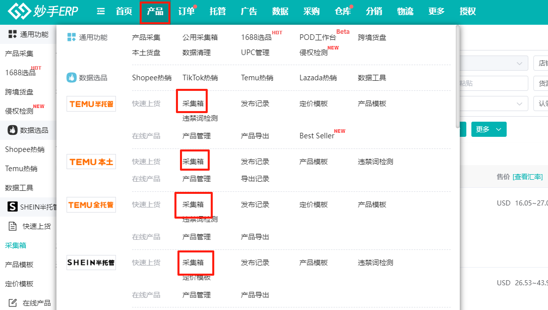 (1)进入Temu半托管/Temu全托管/Temu本土/SHEIN半托管的采集箱