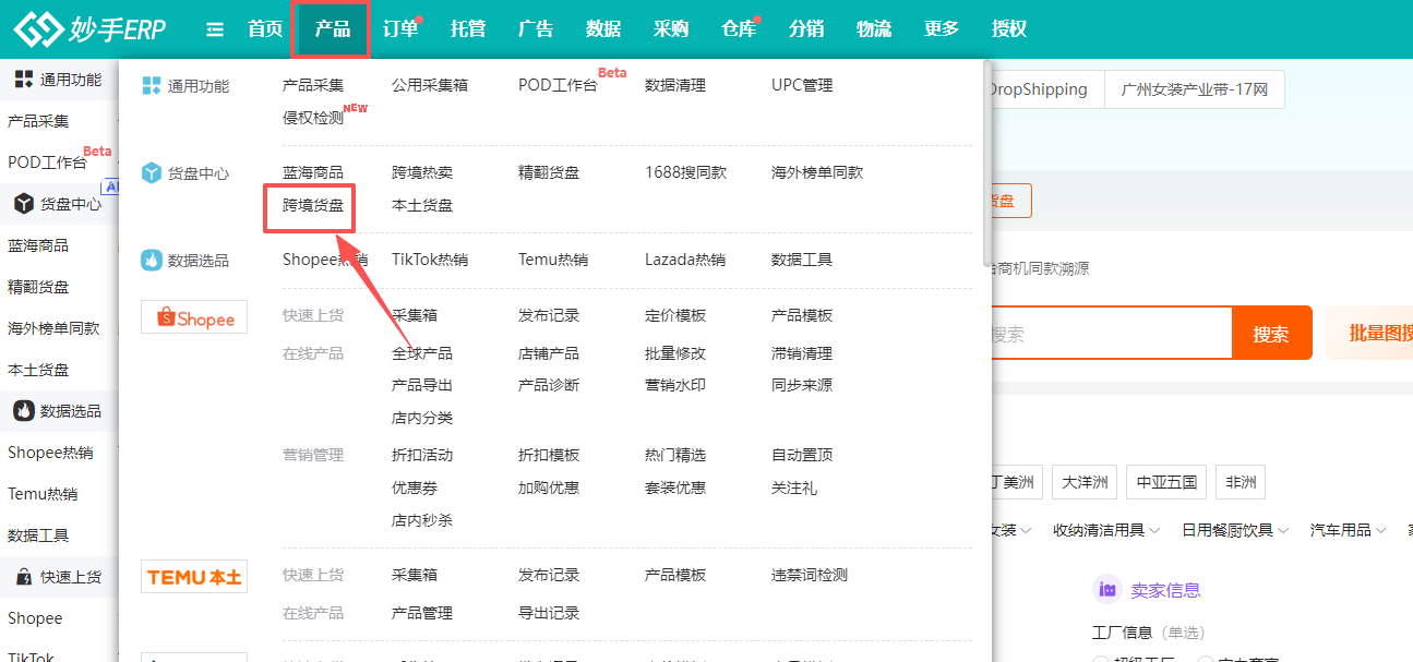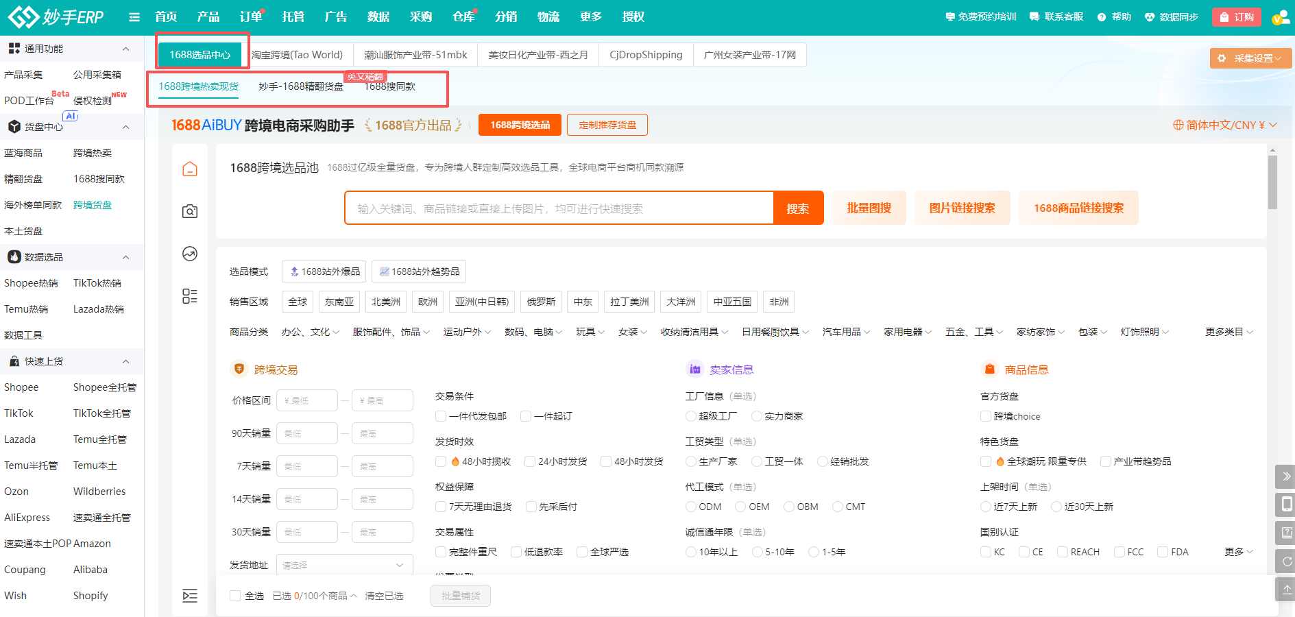 (1)进入界面,选品模式、销售区域、商品分类、价格、卖家信息、商品信息等筛选货源,其中商品分类支持下拉至三级