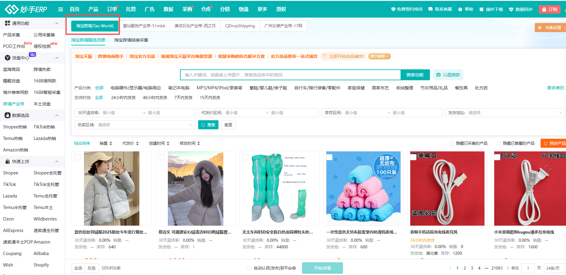 (7)回到跨境货盘=>淘宝跨境界面,即可采集货源产品,具体操作流程可查看:淘宝跨境(Tao World)采集发布流程