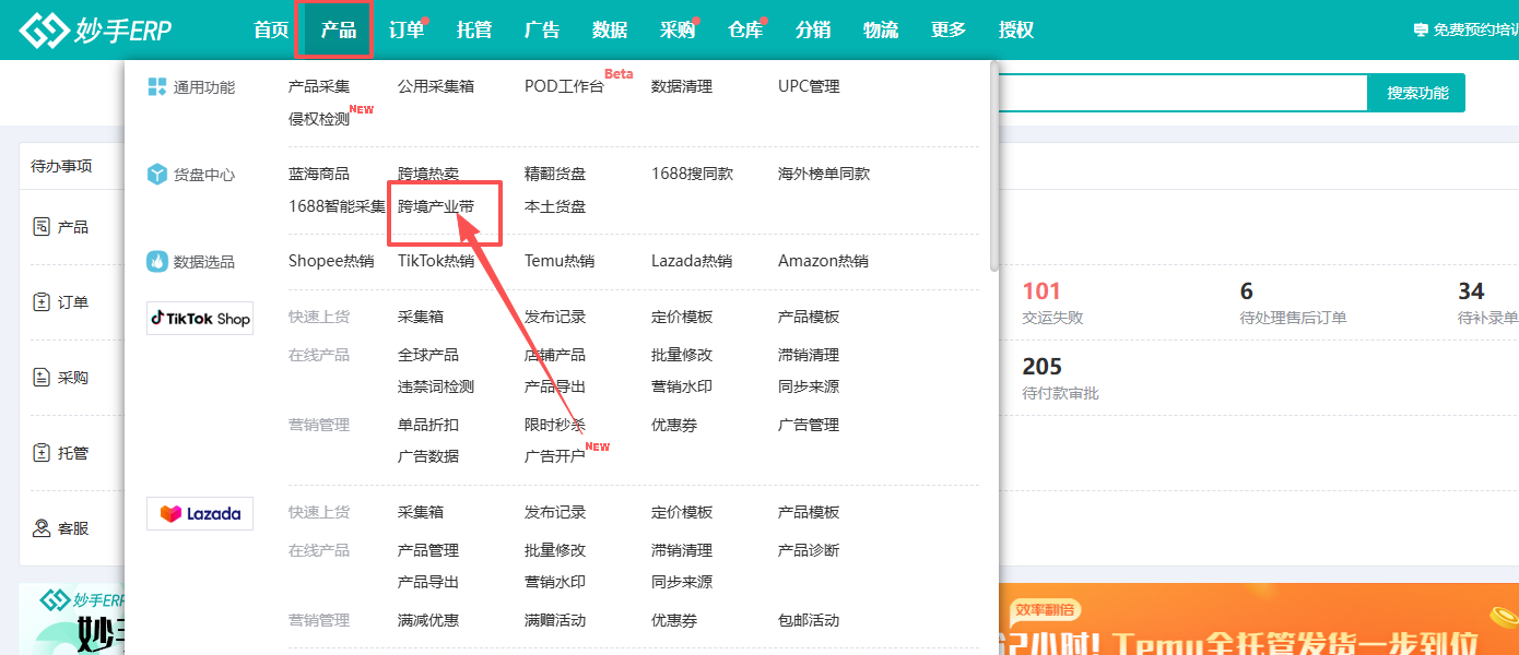 (1)进入妙手ERP=>产品=>跨境产业带=>淘宝跨境(Tao World)