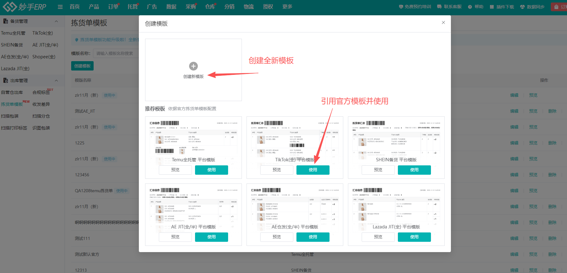 2、目前拣货单功能上线了不同平台官方的拣货单模板,在弹窗中点击模板中的【使用】,根据需求修改模板内容,也支持直接点击【创建新模板】,由自己创建模板内容