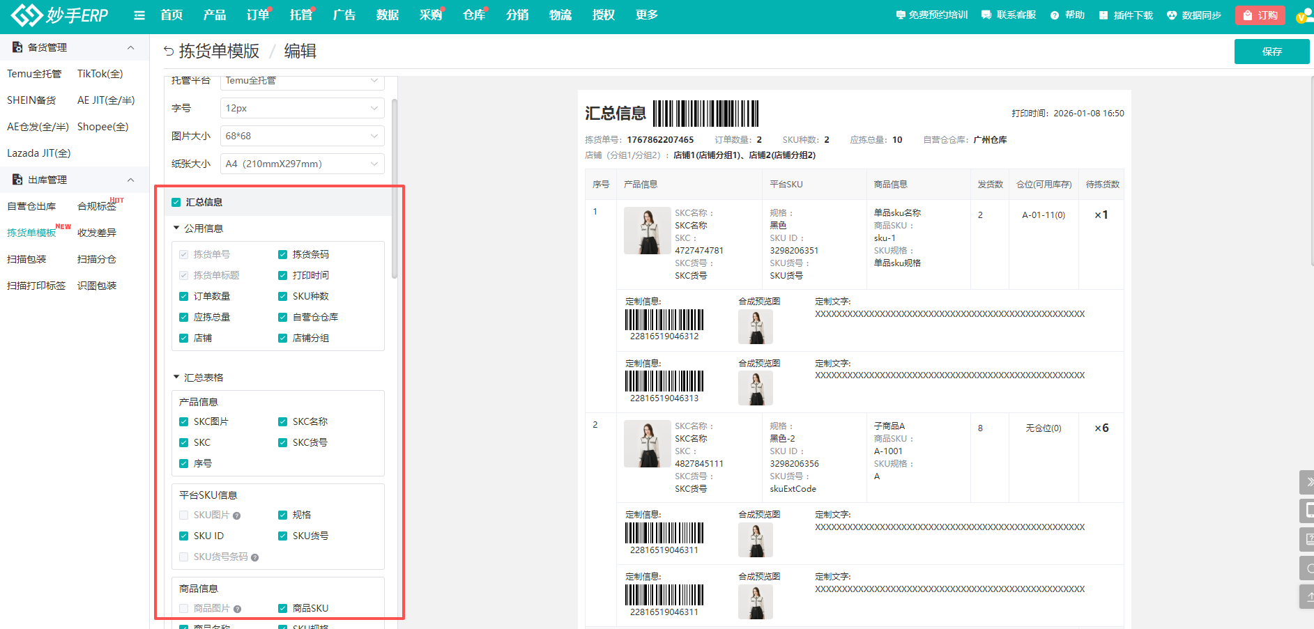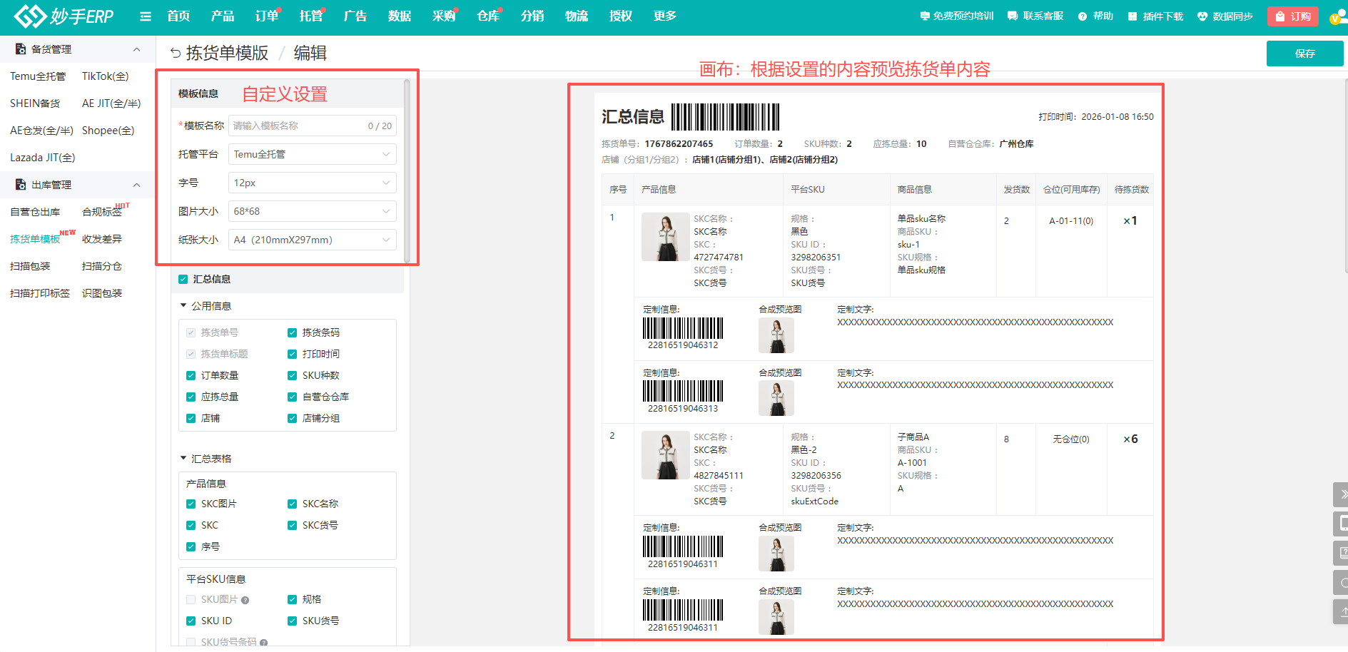 6、后续在平台托管中处理订单时打印拣货单,会按照模板内容打印