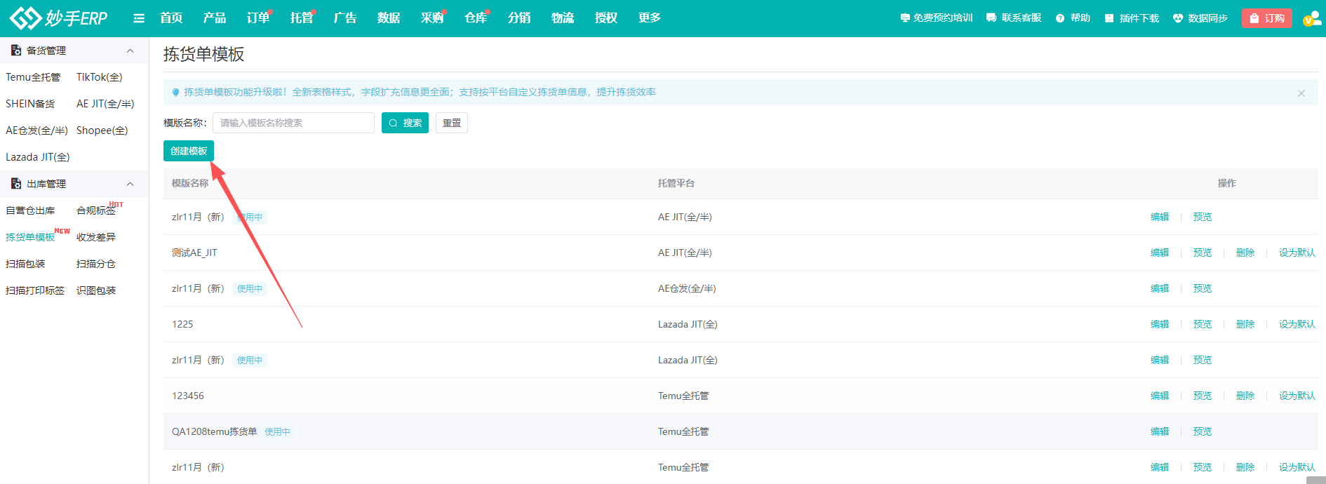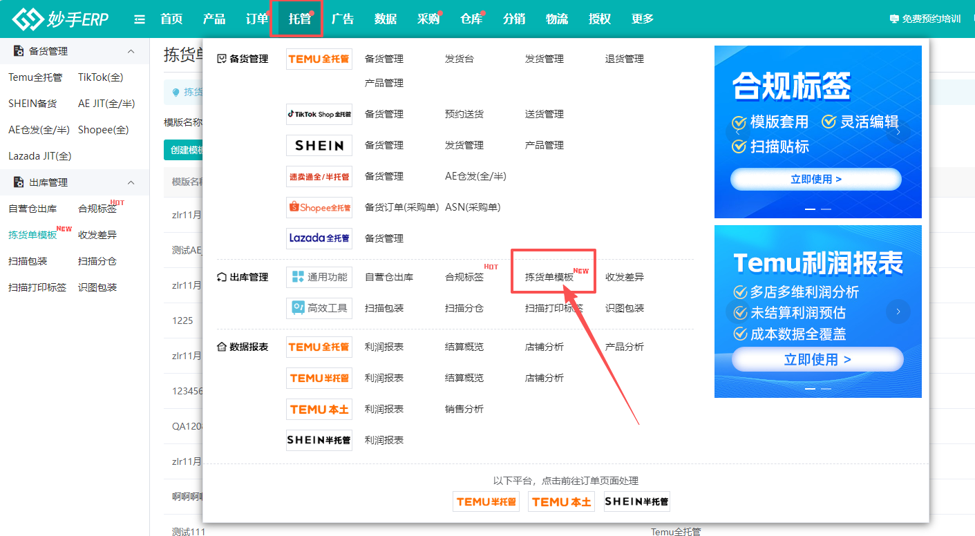 1、进入托管=>出库管理=>拣货单模板,点击【创建模板】