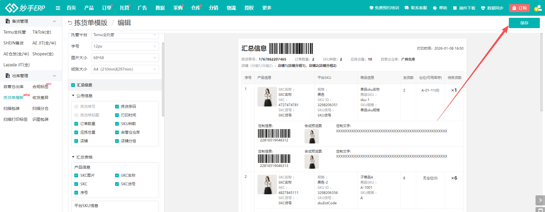 5、设置好之后点击【保存】即可保存拣货单模板
