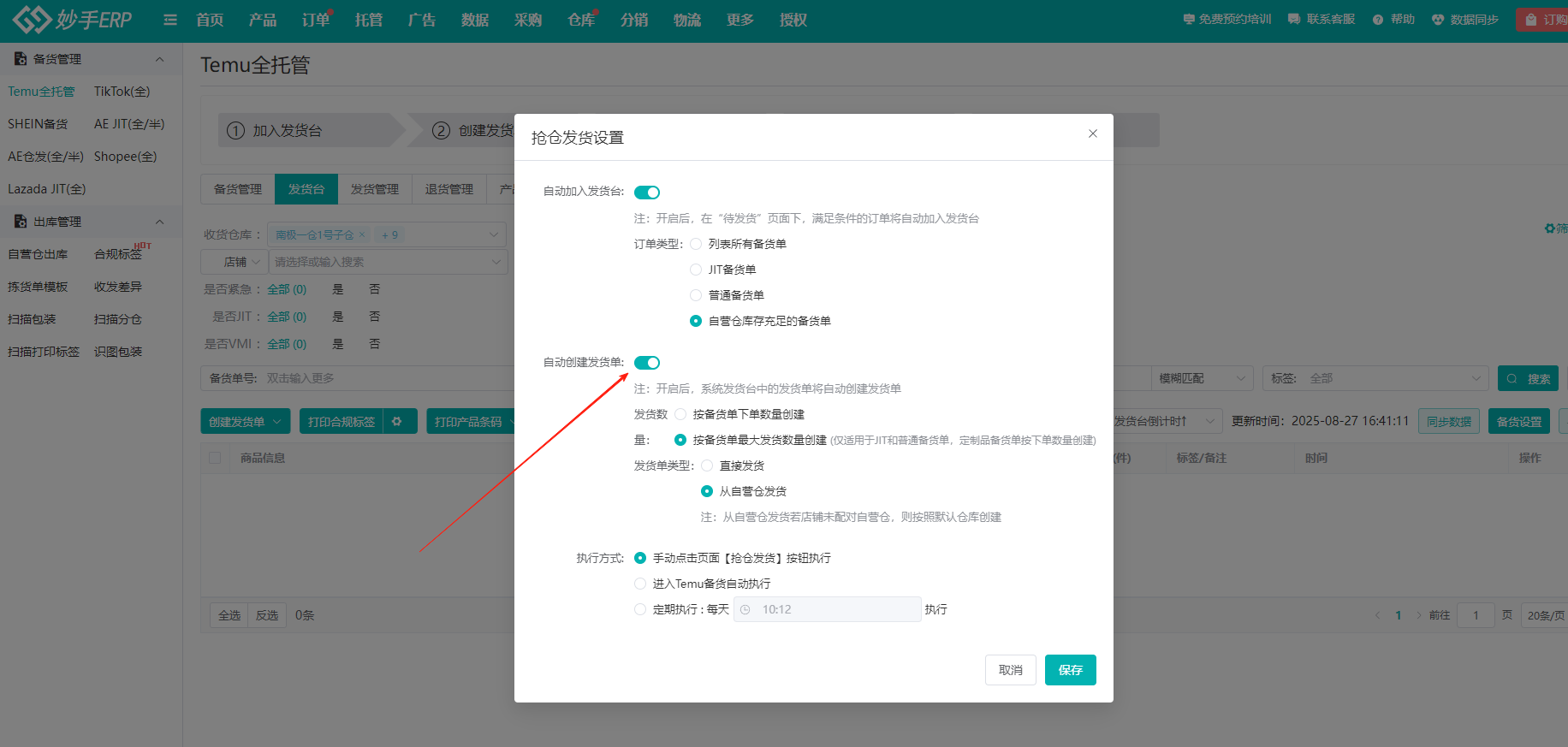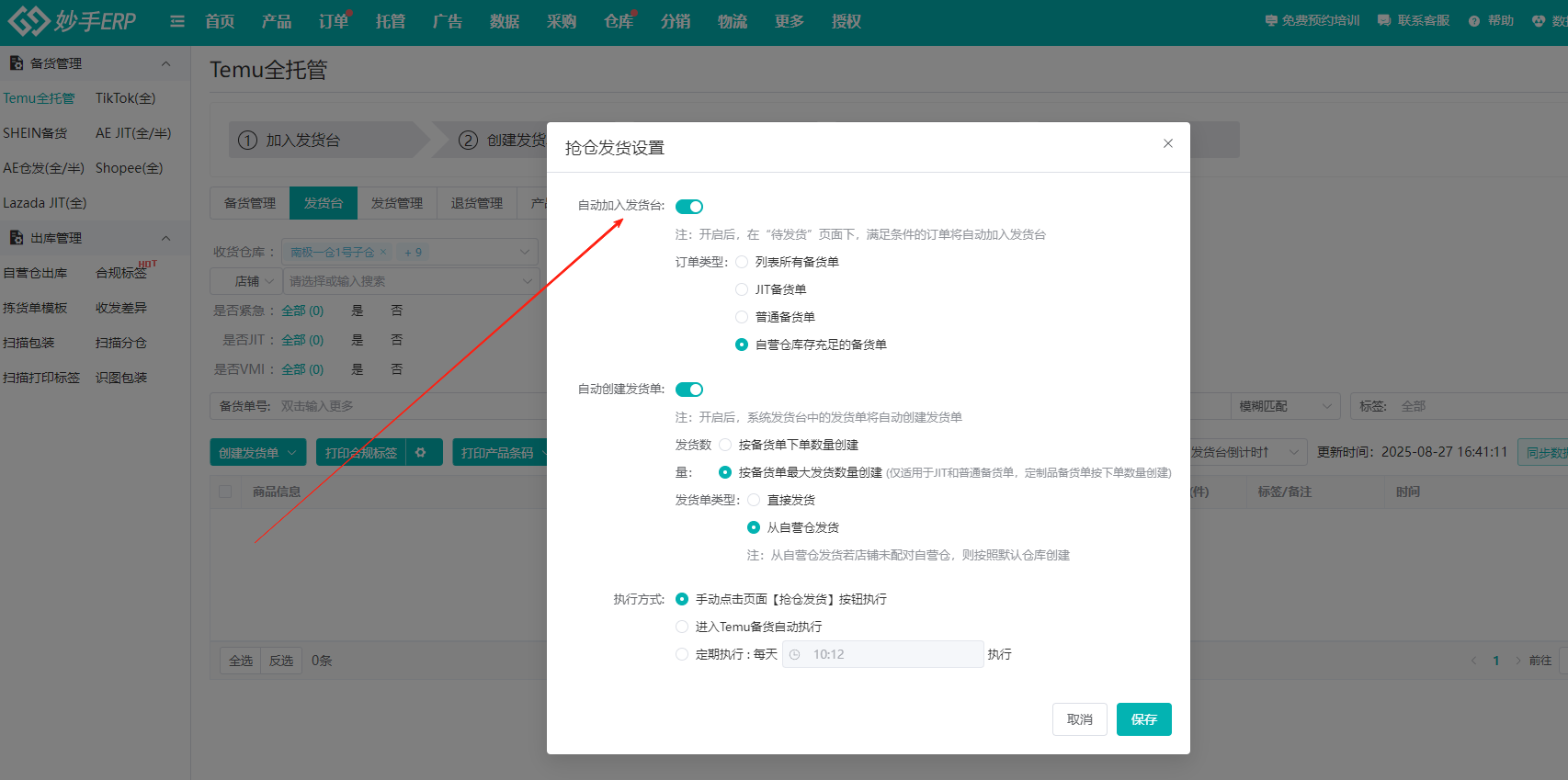 2、在Temu全托管中,开启自动加入发货台功能,系统自动将符合条件的备货单加入发货台,无需手动操作,节省人力成本,高效便捷。