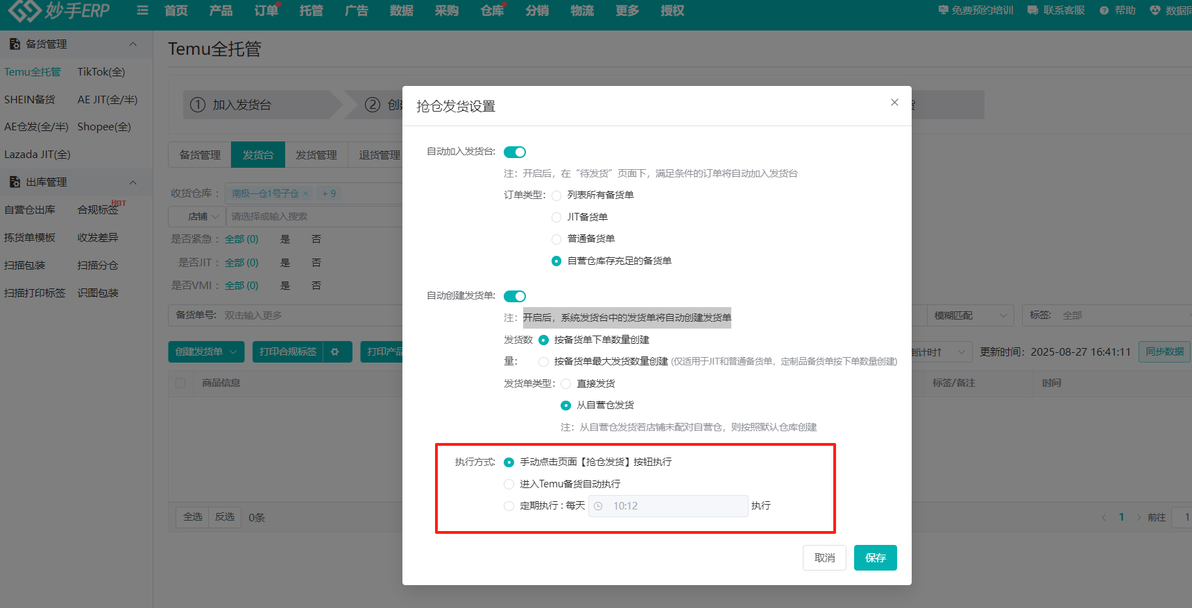 目前抢仓发货支持选择手动点击【抢仓发货】按钮执行、进入备货自动执行以及定期执行三种方式