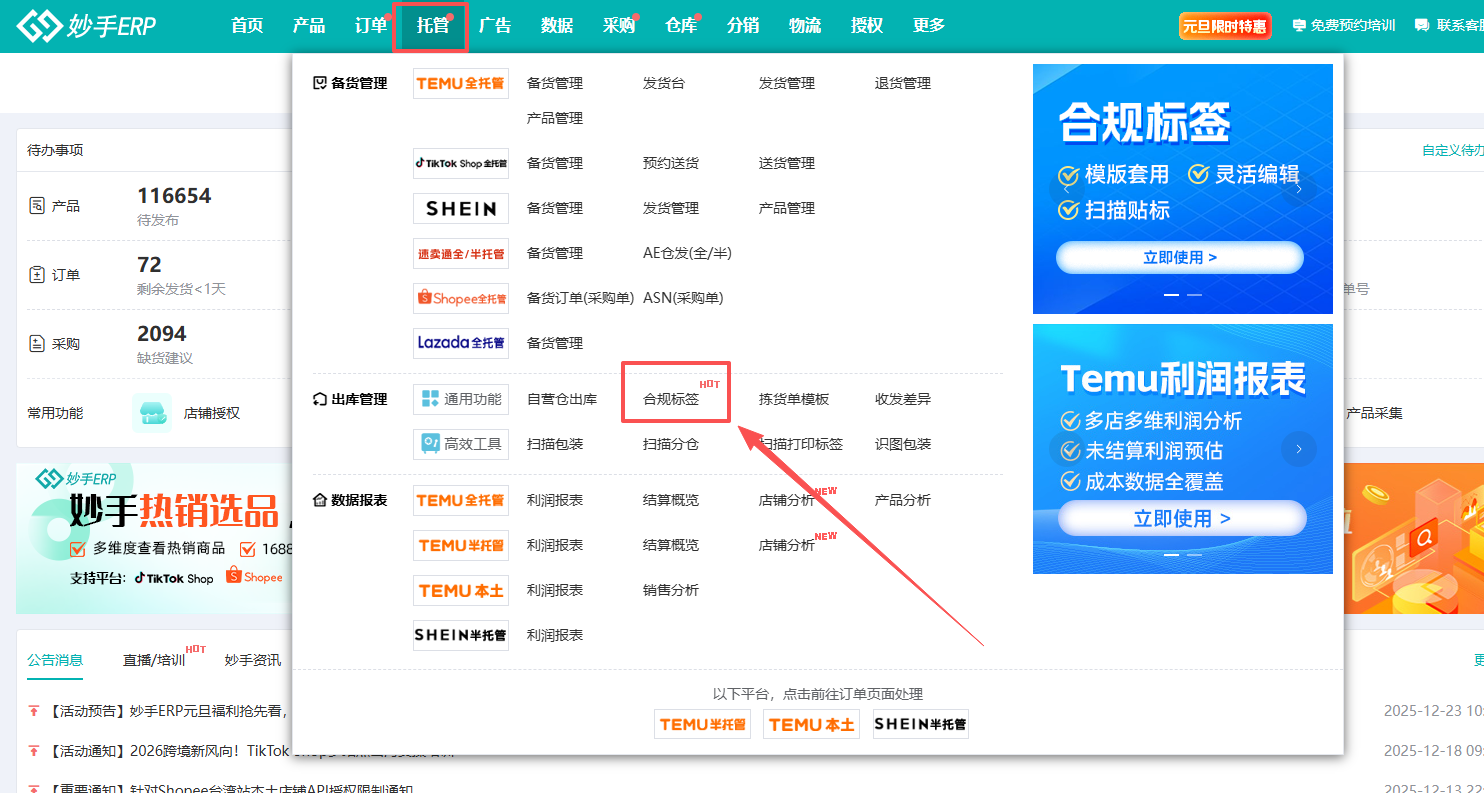 3、目前合规标签支持Temu、TikTok等平台使用,并且在订单处理时可直接操作打印合规标签