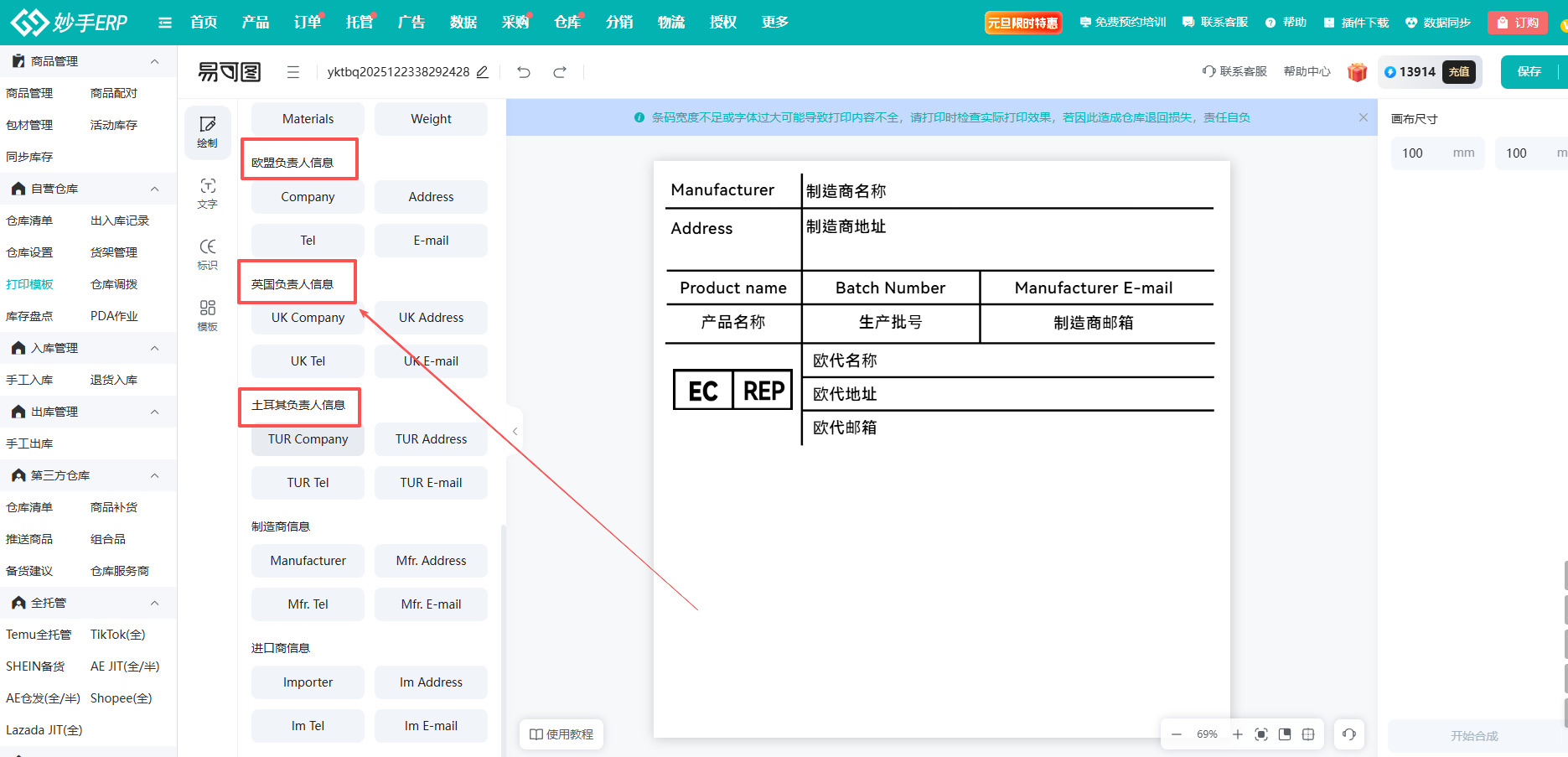 (5)左侧标签涵盖产品信息、欧盟、英国、土耳其负责人、也有多场景标签标识、图片,满足不同卖家、不同平台的使用需求
