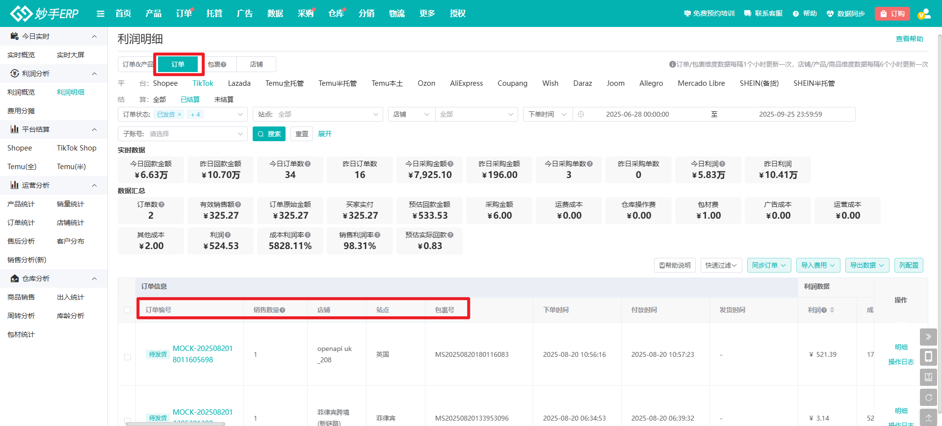 操作流程:数据=>利润明细=>包裹=>TikTok=>选择结算状态,按需筛选订单=>填写或确认订单成本=>查看利润及各项平台结算数据