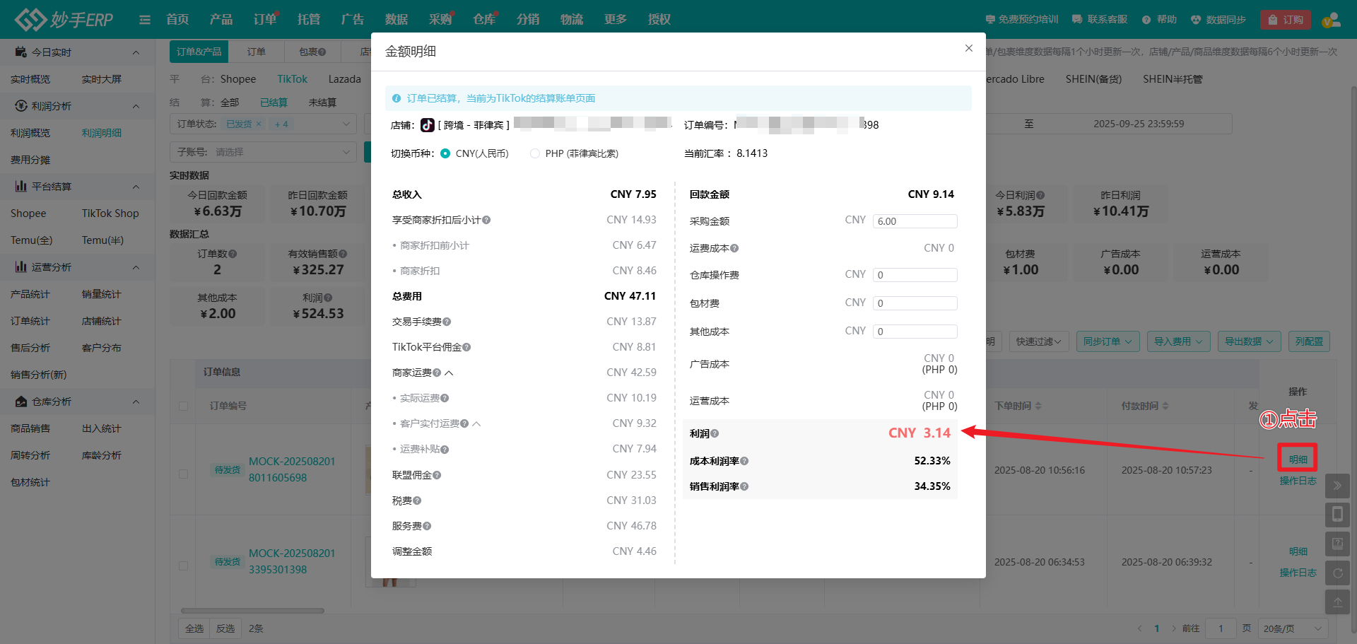 操作流程:数据=>利润明细=>订单=>TikTok=>选择结算状态,按需筛选订单=>填写或确认订单成本=>查看利润及各项平台结算数据