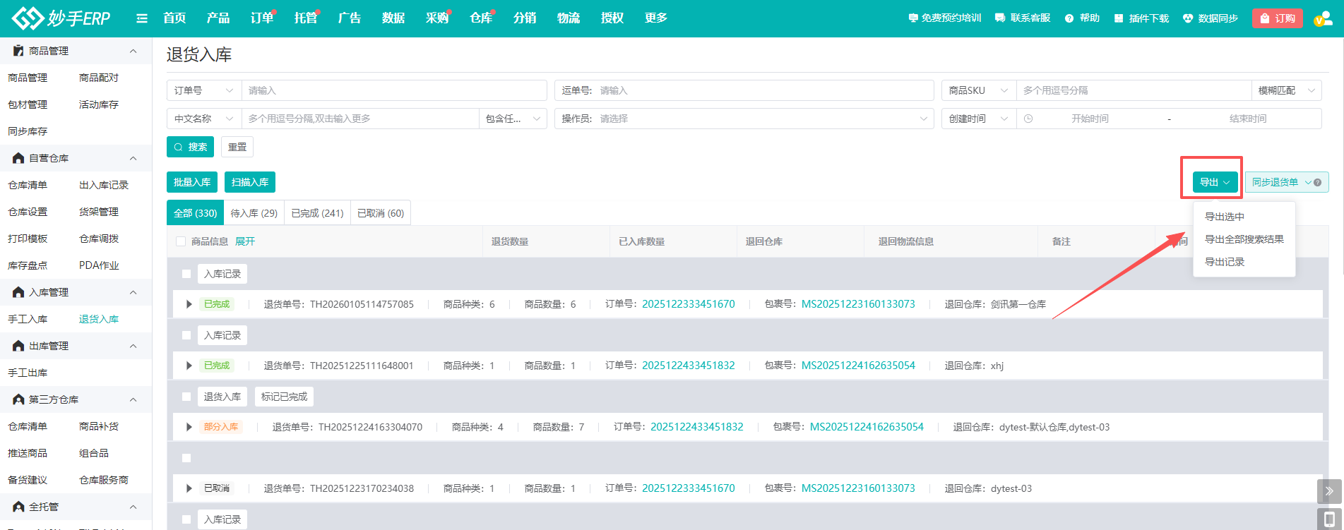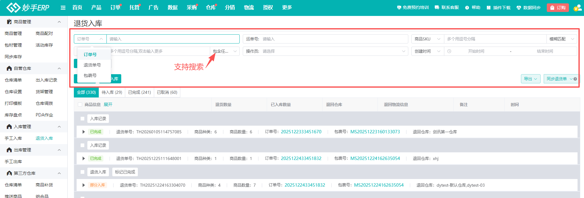 1、进入妙手ERP=>仓库=>退货入库,进入功能界面,可点击【同步退货单】,更新数据