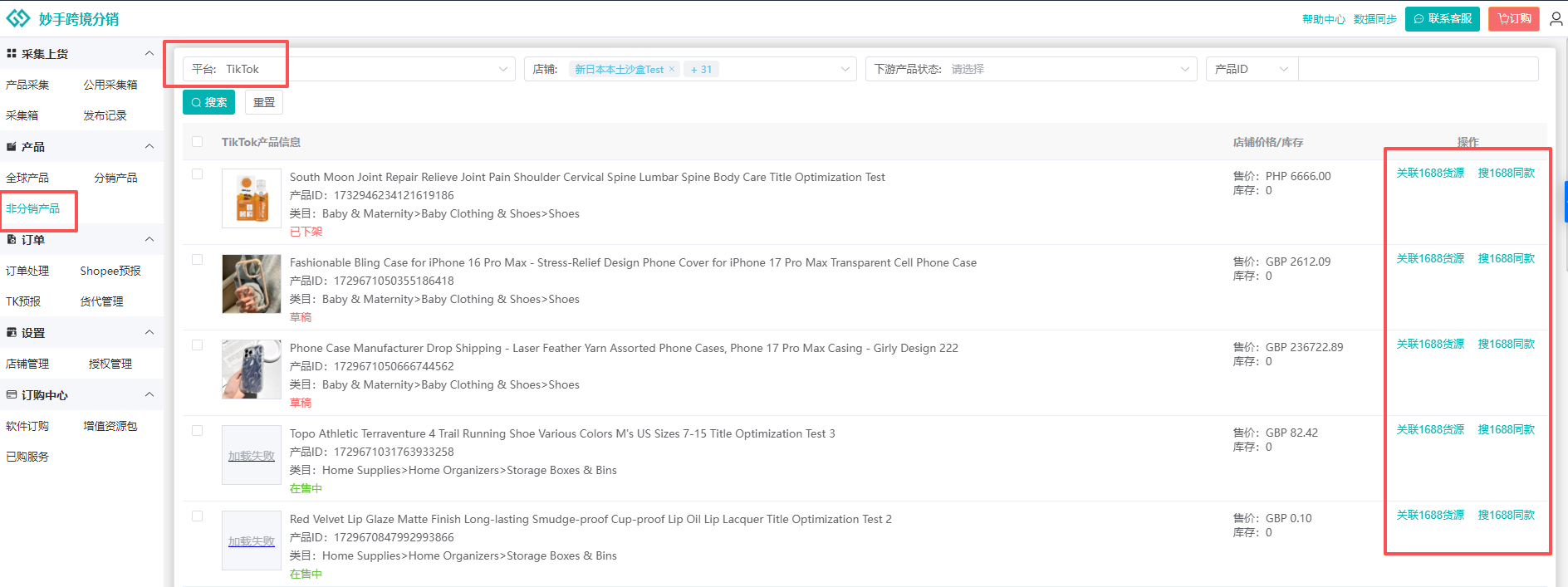 (3)授权店铺内已经上线的产品,如果是非跨境分销发布,或来源非1688的产品,需要进入非分销产品中查看,支持在此界面中关联1688货源,或者直接搜同款关联