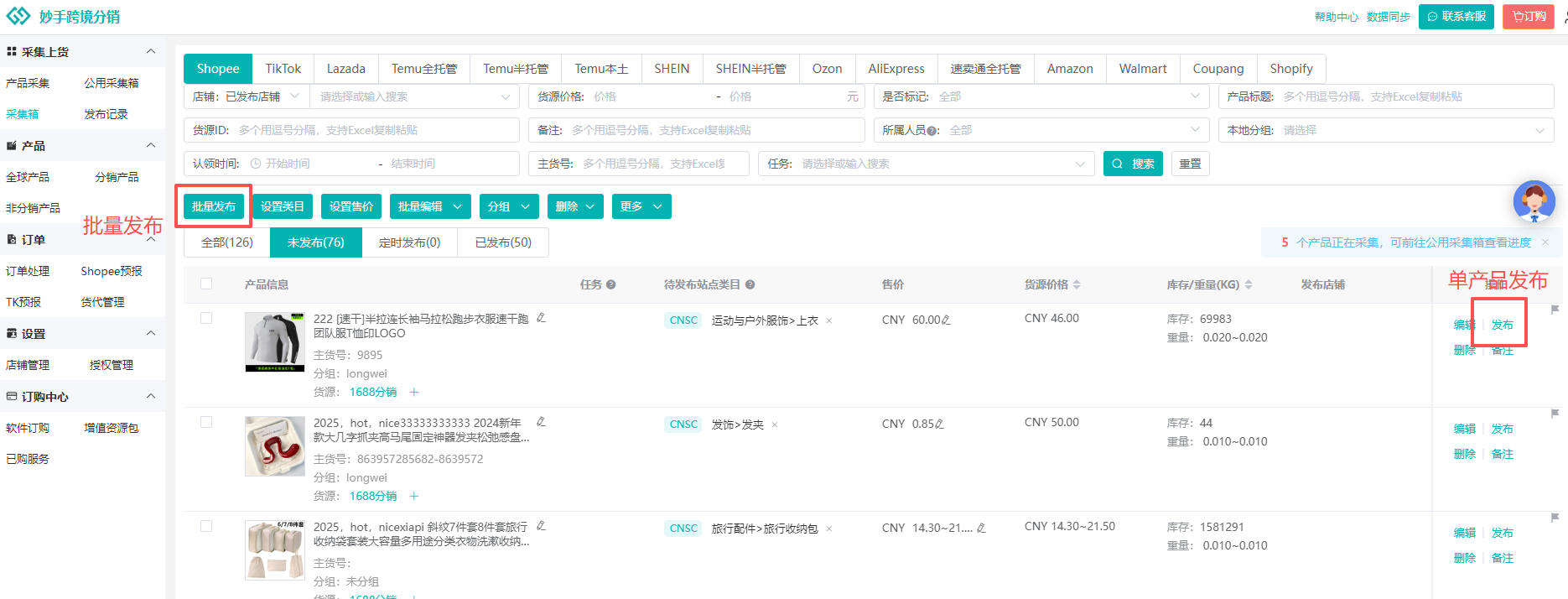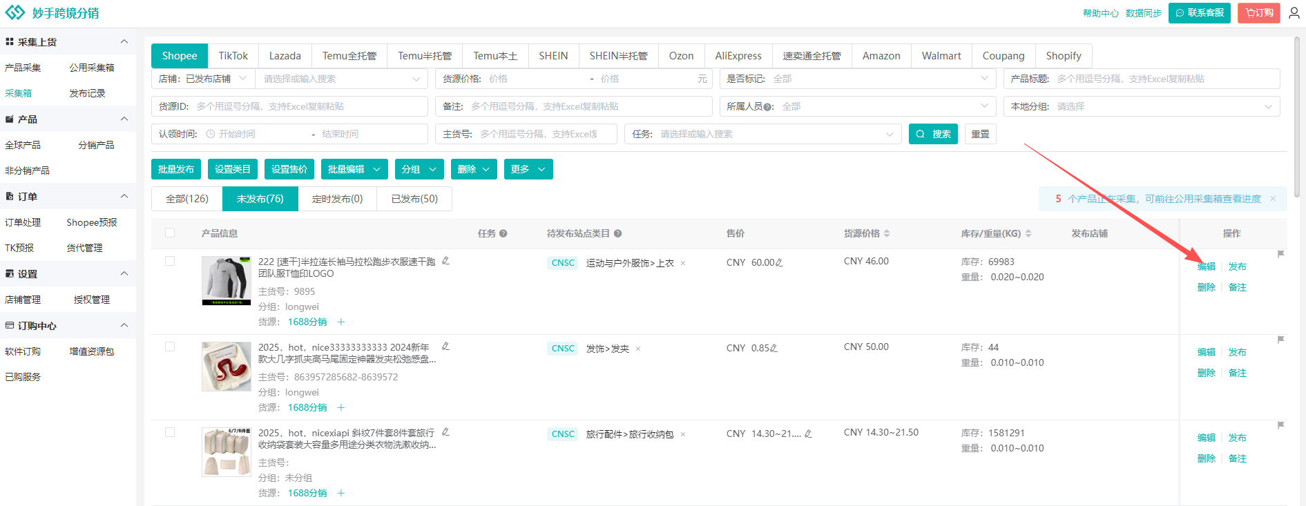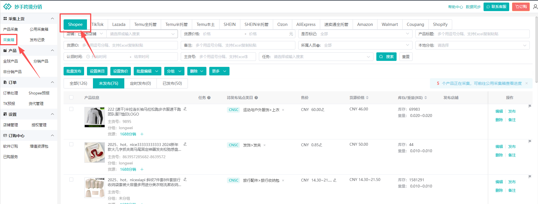 (1)产品认领到Shopee采集箱后,进入采集箱=>Shopee
