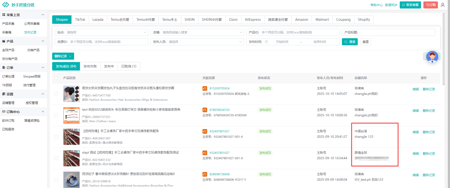 (2)全球的发布记录会显示多条,分别是发布到全球店与发布到店铺
