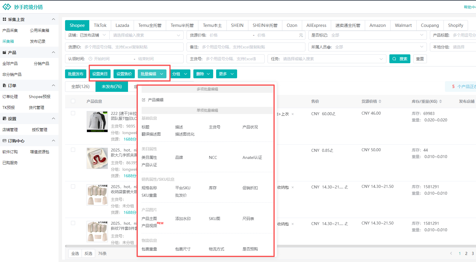 (2)在此界面中支持批量编辑产品的售价、基础信息、类目属性、主图、水印等