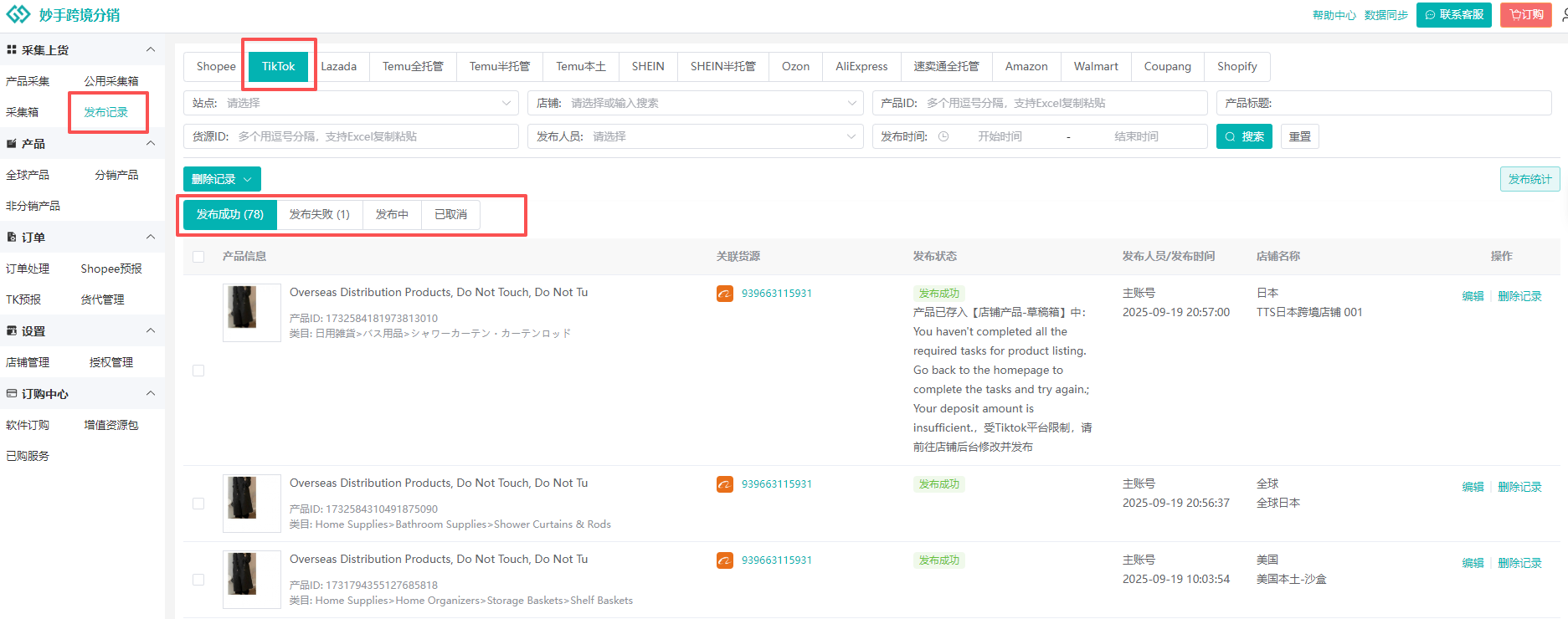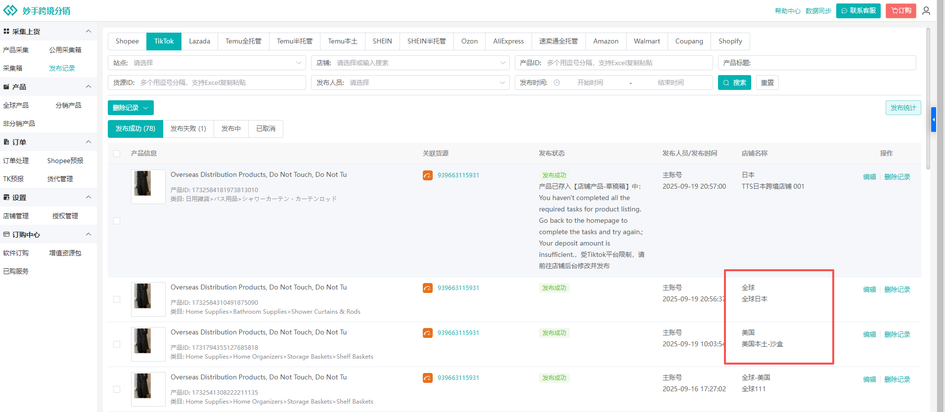 (2)全球的发布记录会显示多条,分别是发布到全球店与发布到店铺