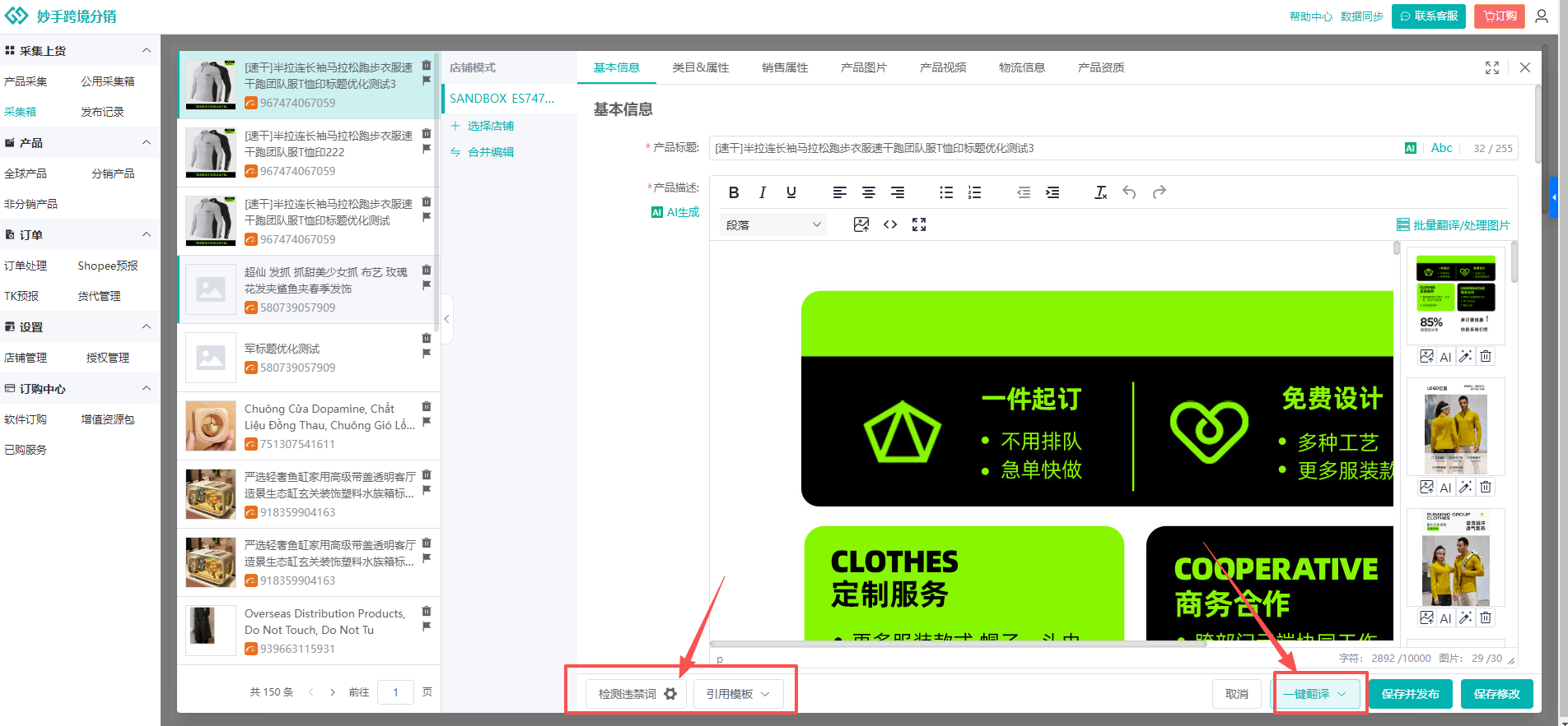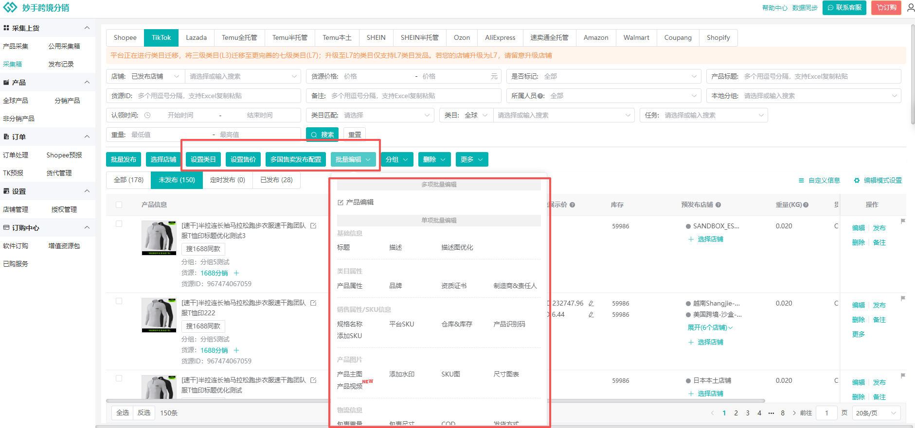 (3)在此界面中支持批量编辑产品的售价、基础信息、类目属性、主图、水印等