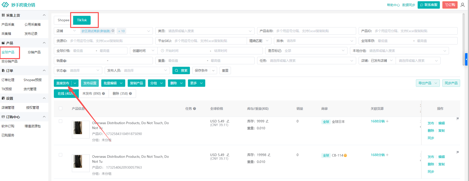 ③继续进入全球产品=>TikTok界面,支持二次修改产品信息,勾选需要发布的产品,点击【直接发布】