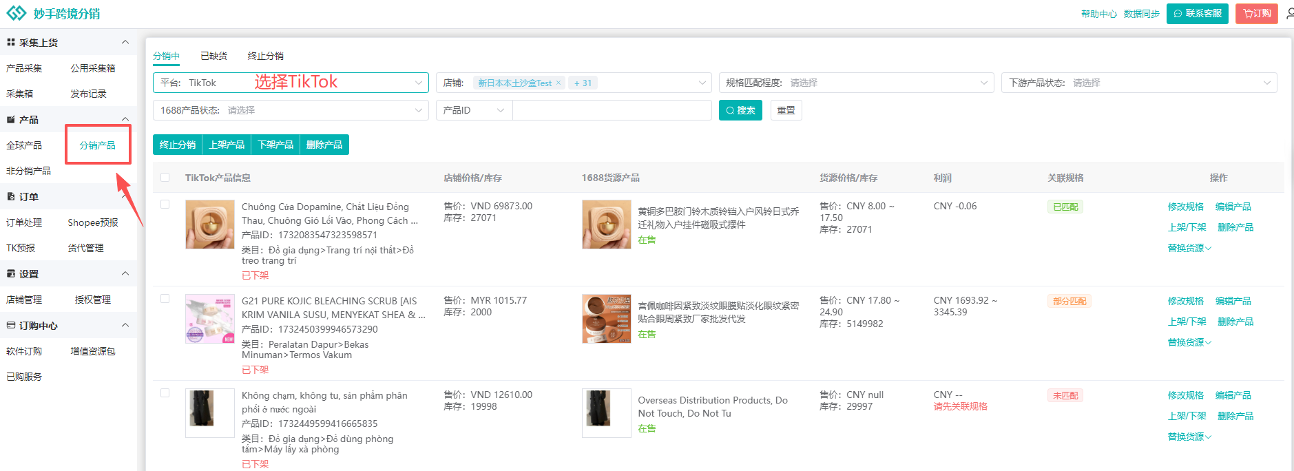 (3)授权店铺内已经上线的产品,如果是非跨境分销发布,或来源非1688的产品,需要进入非分销产品中查看,支持在此界面中关联1688货源,或者直接搜同款关联