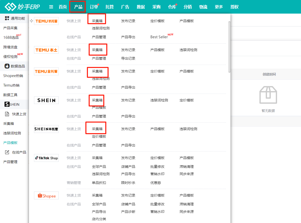 (1)进入妙手ERP界面,选择产品=>选择操作平台=>点击采集箱