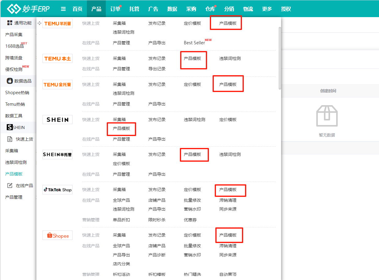 (1)进入妙手ERP界面,选择产品=>选择需要操作的平台=>点击产品模板