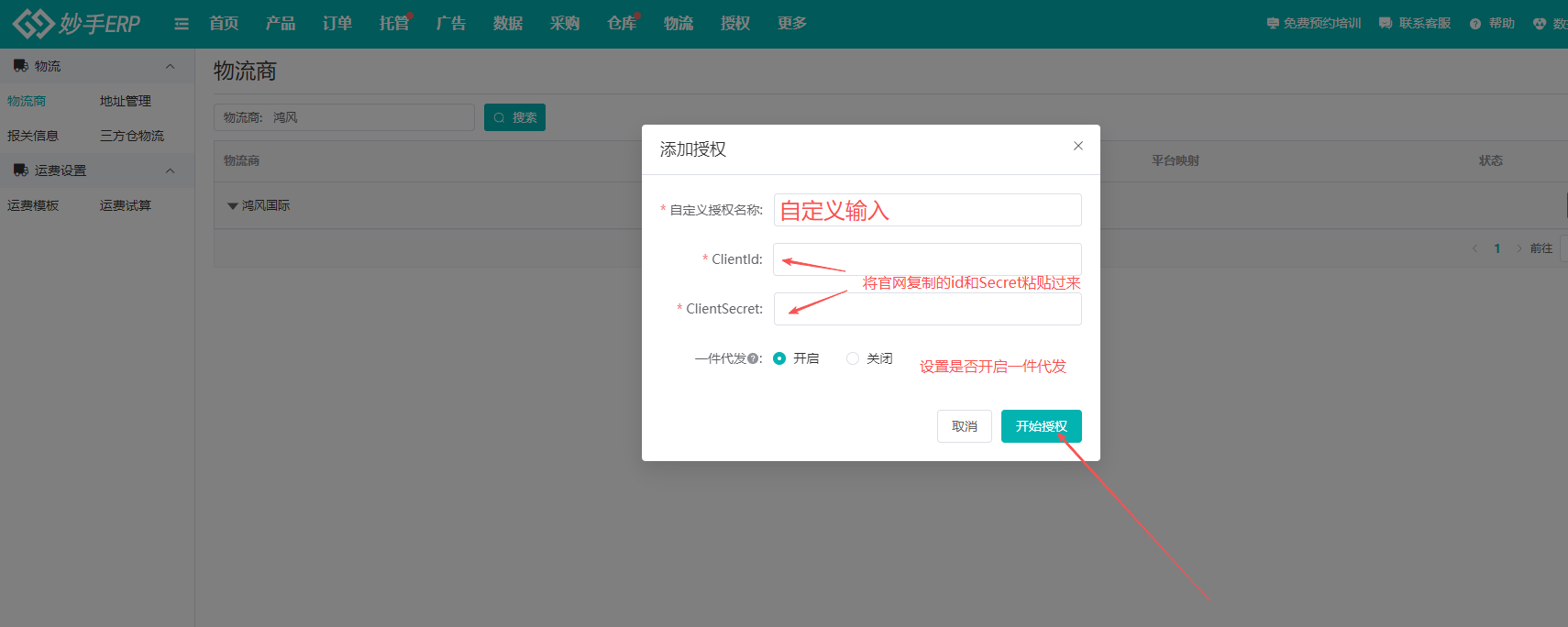 (2)进入妙手ERP,选择物流=>物流商=>找到鸿风国际,点击【添加授权】