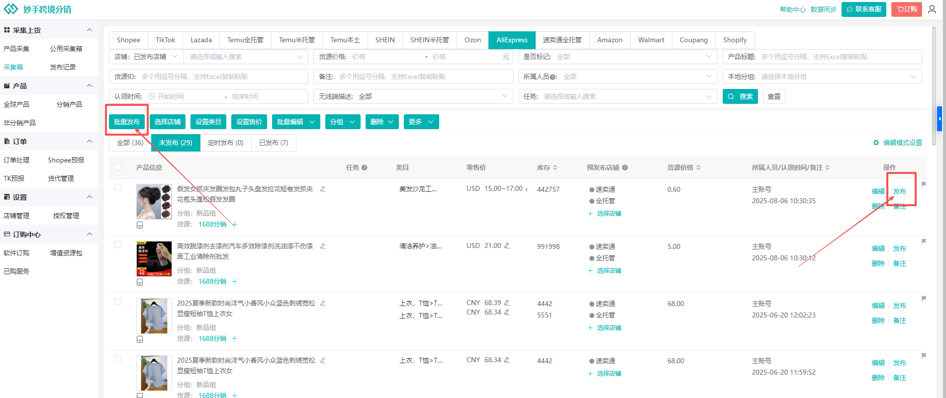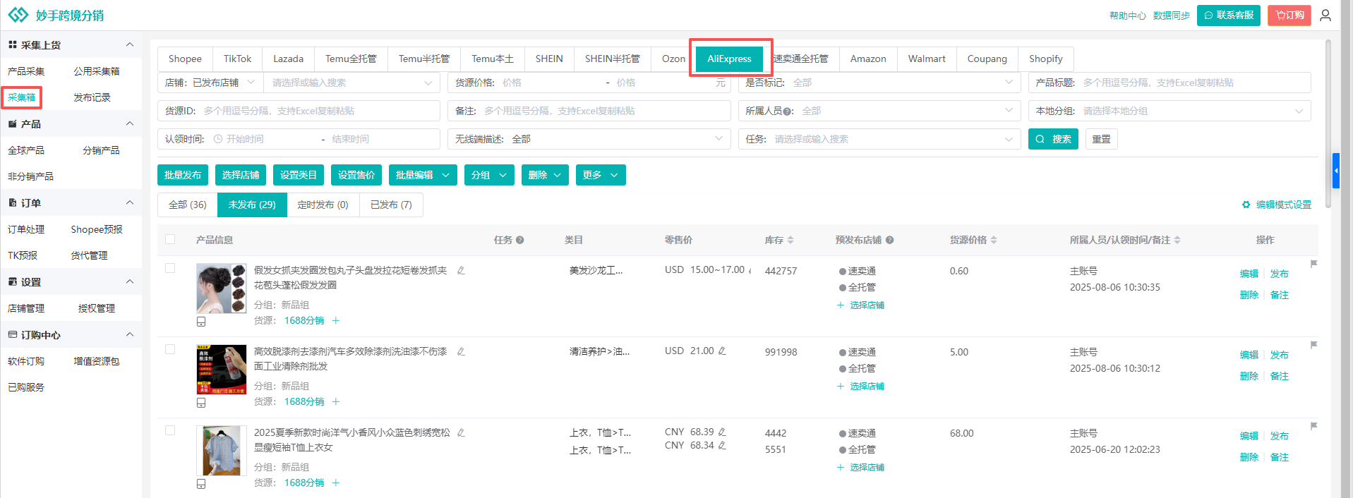 (1)产品认领到AliExpress后,进入采集箱=>AliExpress
