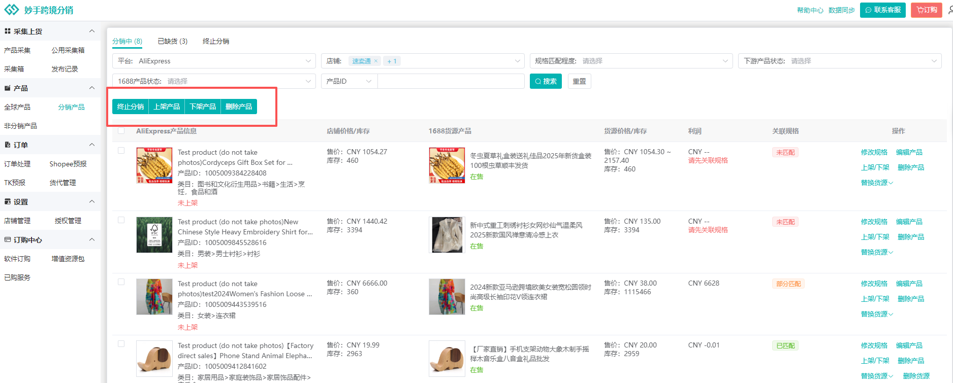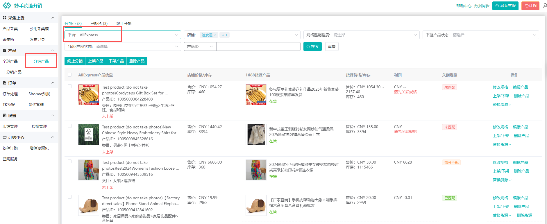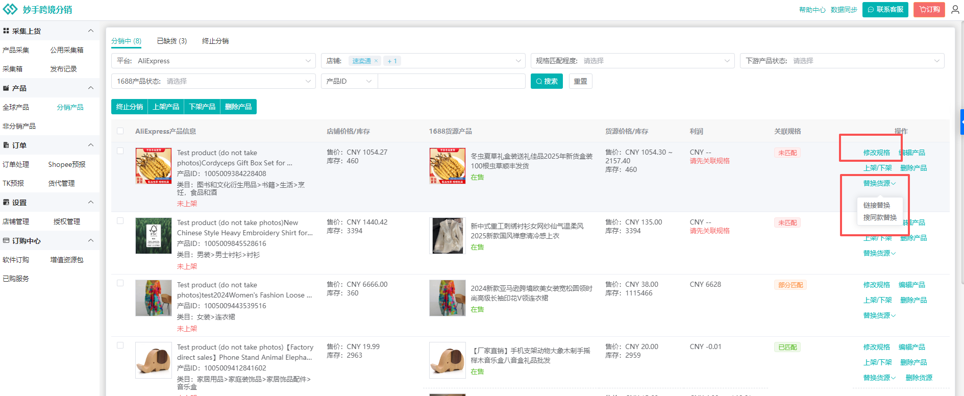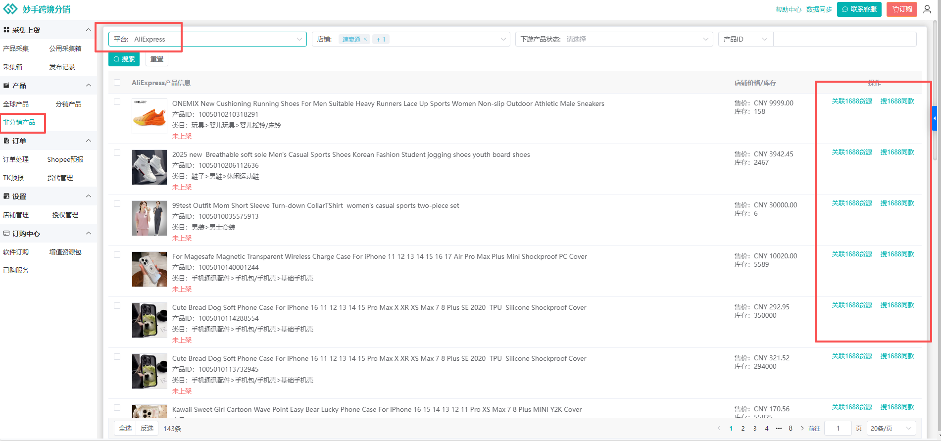 (6)授权店铺内已经上线的产品,如果是非跨境分销发布,或来源非1688的产品,需要进入非分销产品中查看,支持在此界面中关联1688货源,或者直接搜同款关联