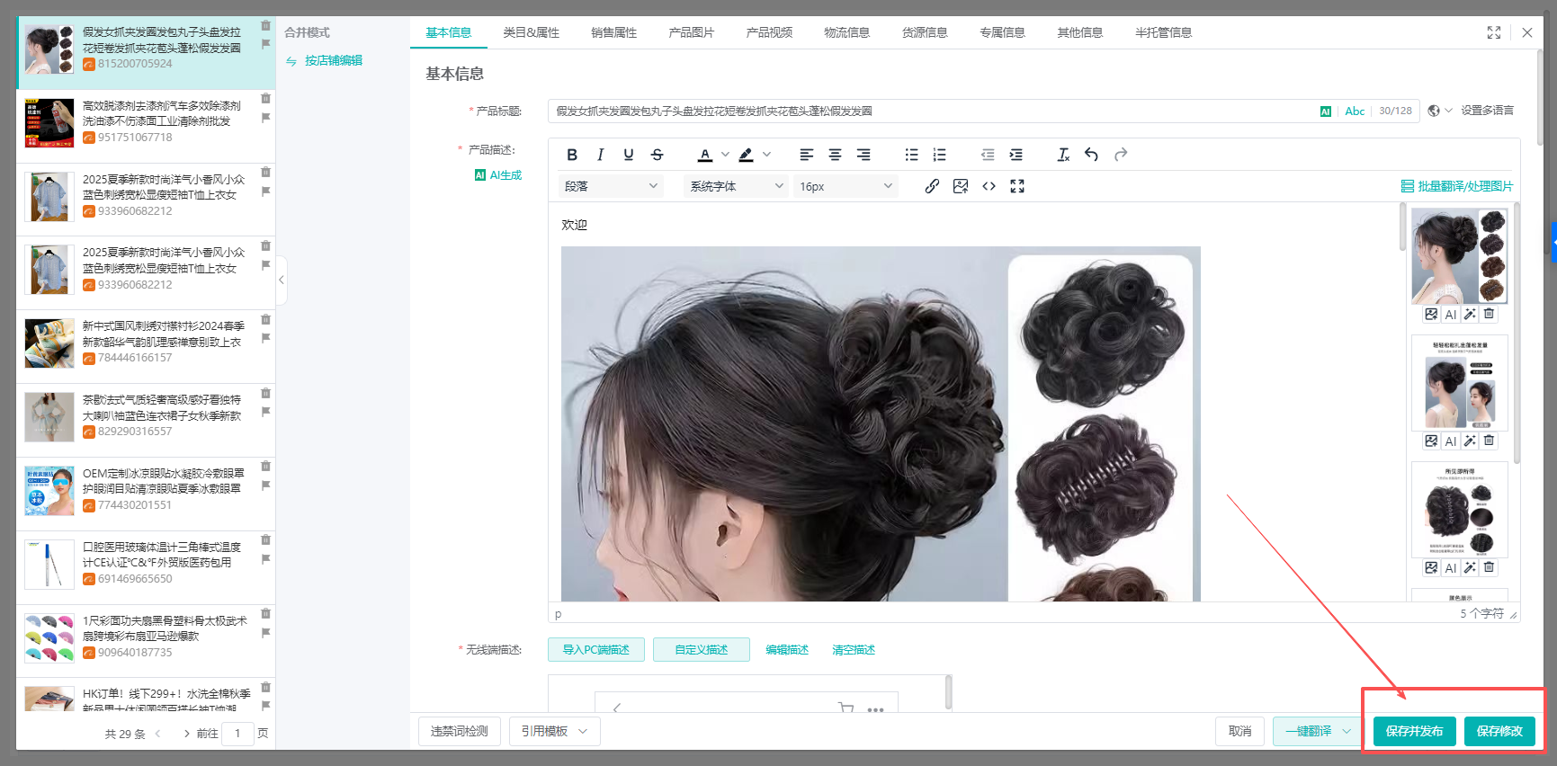 (1)在上一步骤中,如果是选择【保存修改】,产品会保存在草稿箱中,产品编辑好之后可以进行发布,软件支持批量发布、单产品发布