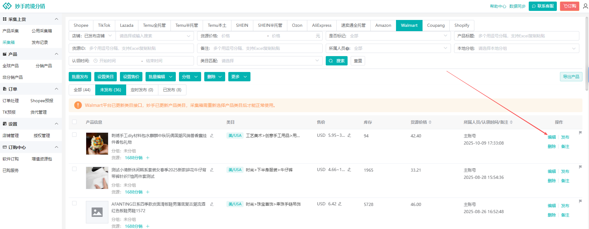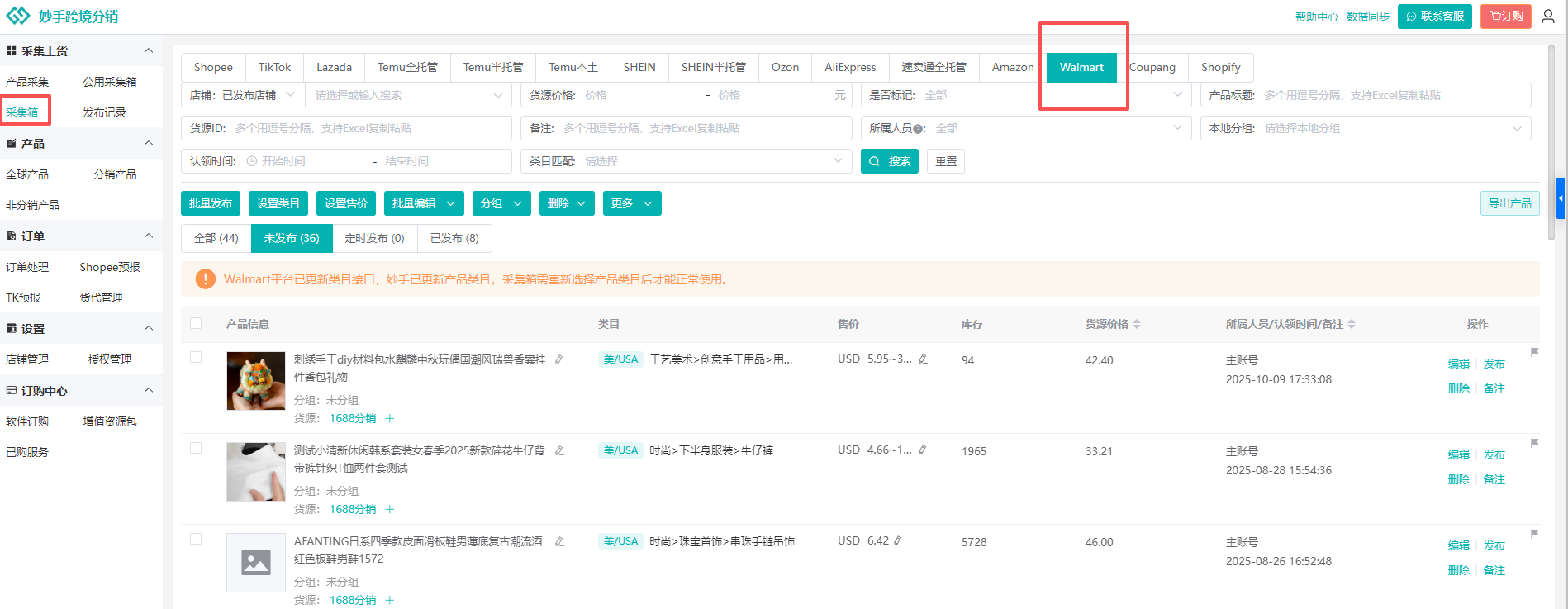(1)产品认领到Walmart后,进入采集箱=>Walmart