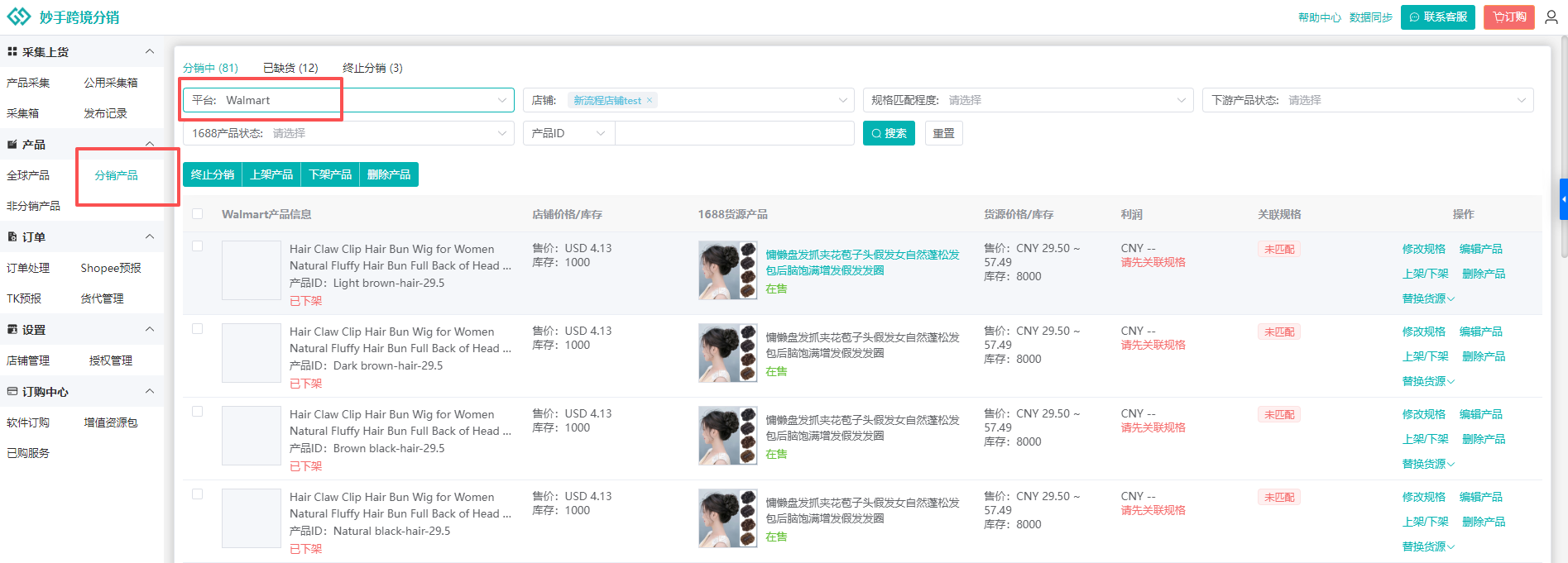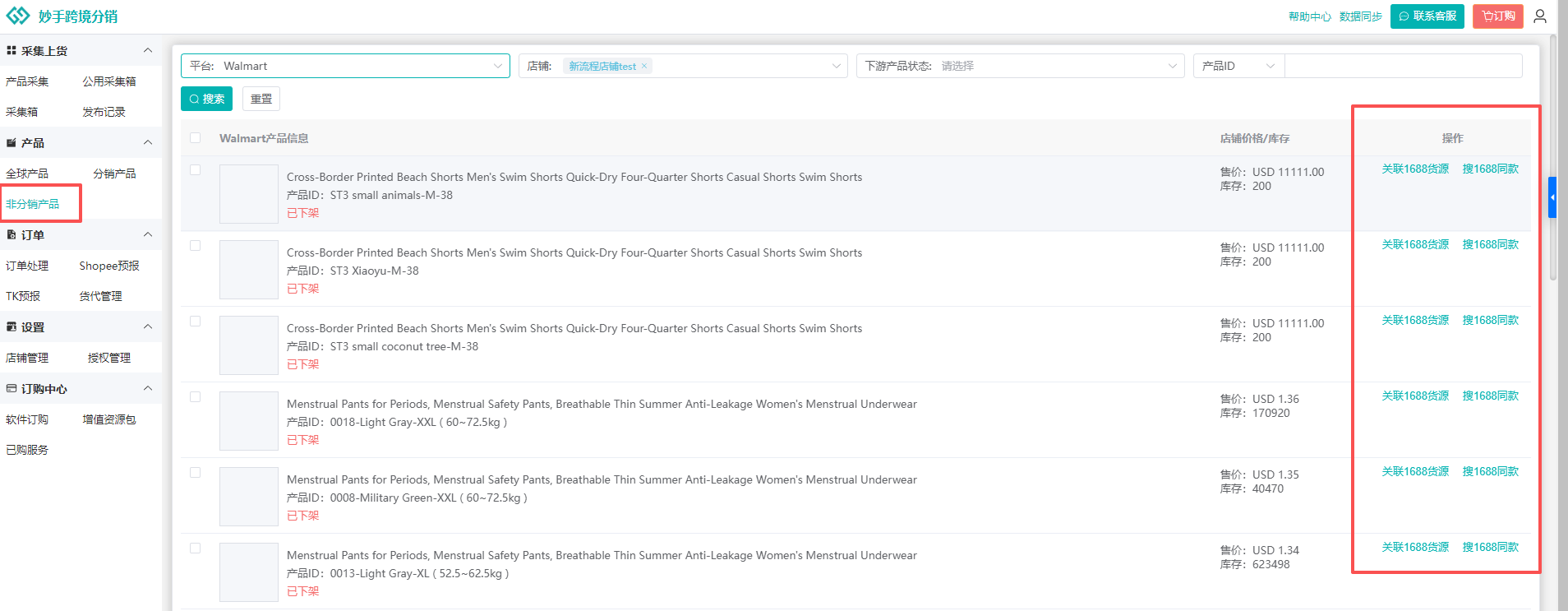 (6)授权店铺内已经上线的产品,如果是非跨境分销发布,或来源非1688的产品,需要进入非分销产品中查看,支持在此界面中关联1688货源,或者直接搜同款关联
