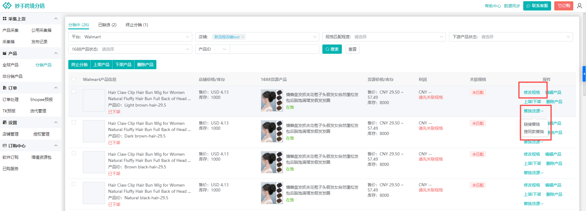 (5)支持修改规格(关联规格)和替换货源,未匹配到的规格,支持直接录入货源链接或搜同款关联