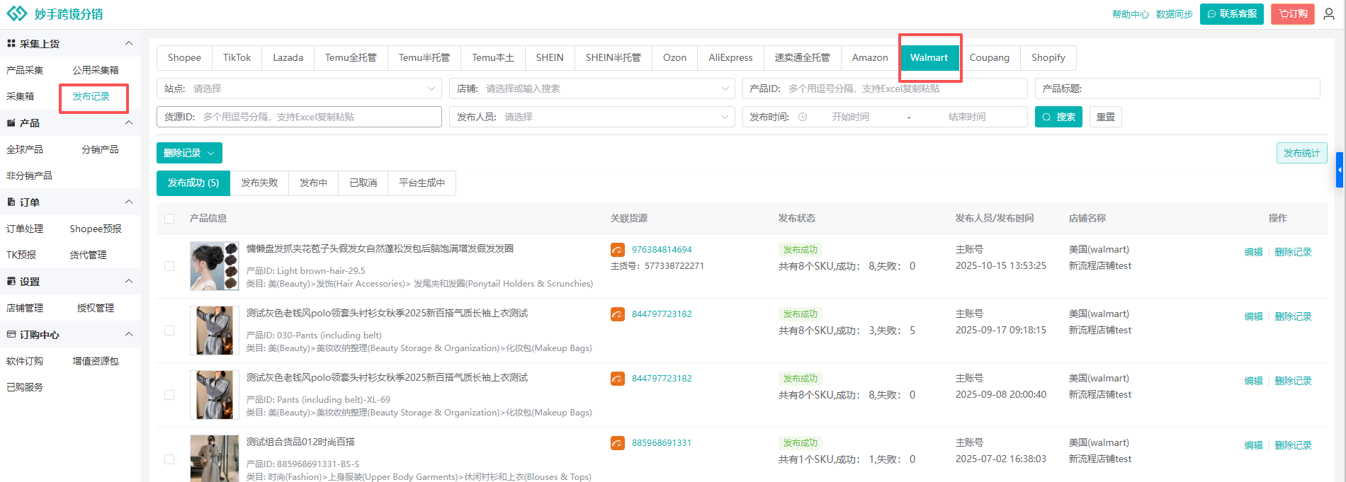 (2)授权后,进入店铺管理,授权需要发布商品的Walmart,具体操作流程可跳转查看:Walmart店铺授权-妙手轻应用