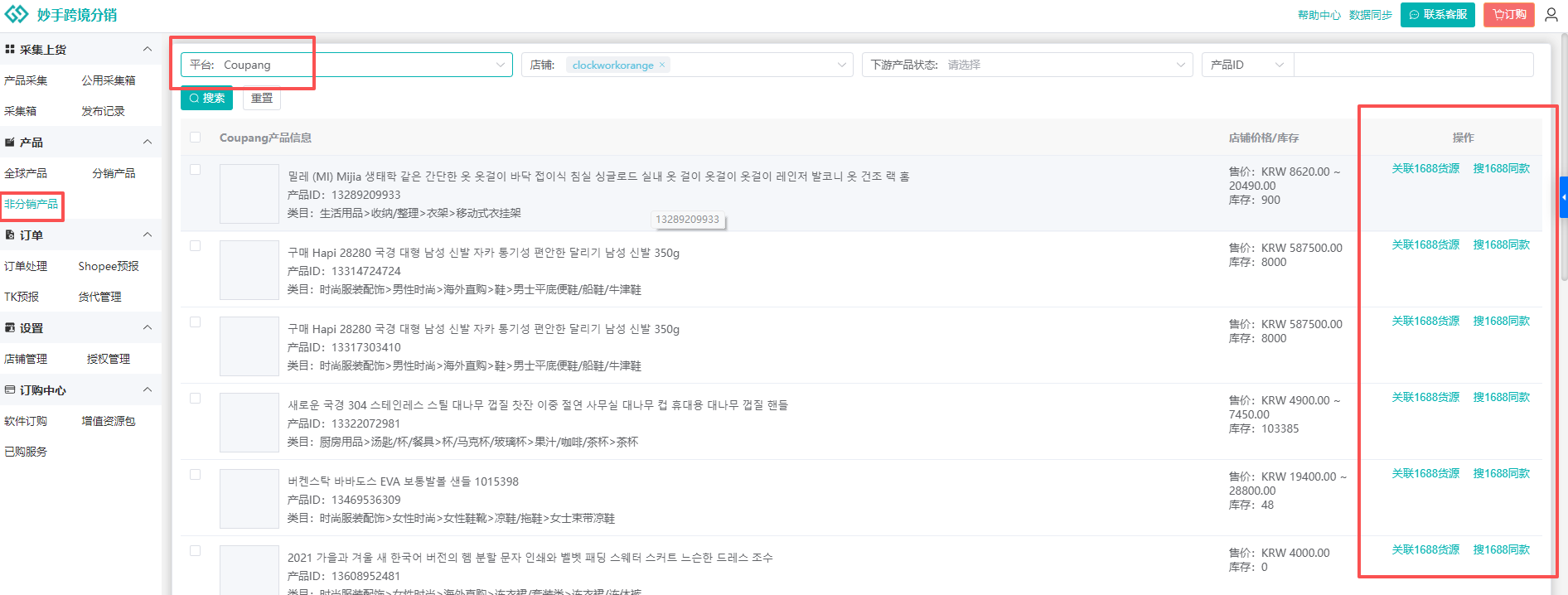 (5)授权店铺内已经上线的产品,如果是非跨境分销发布,或来源非1688的产品,需要进入非分销产品中查看,支持在此界面中关联1688货源,或者直接搜同款关联