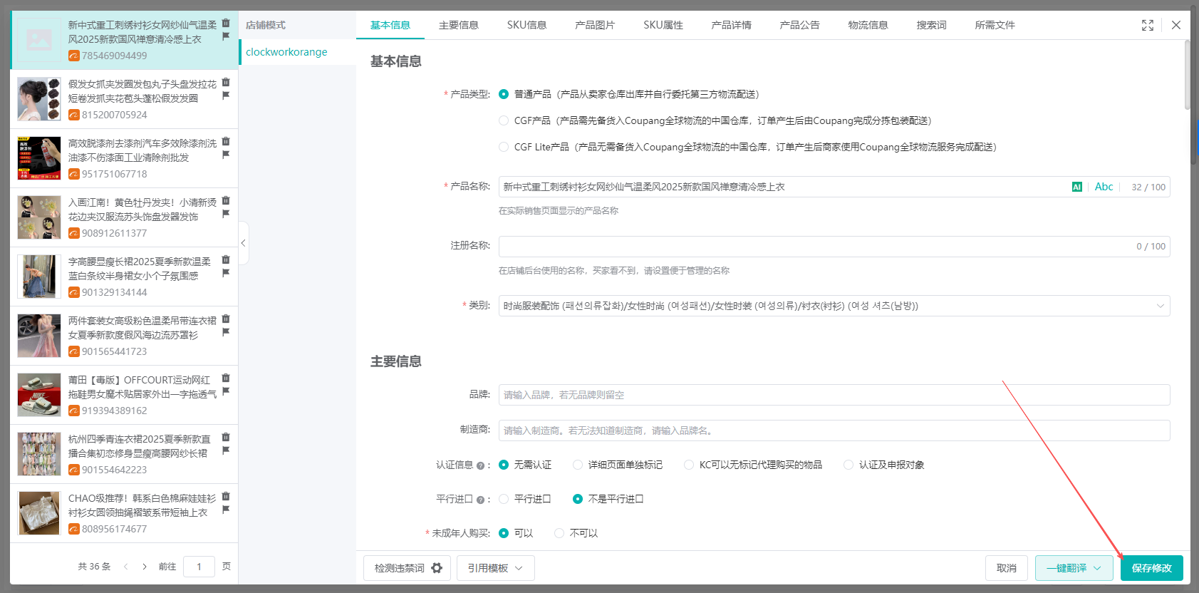 (8)产品信息编辑,带红色*的选项为必填项,编辑好后,点击【保存修改】
